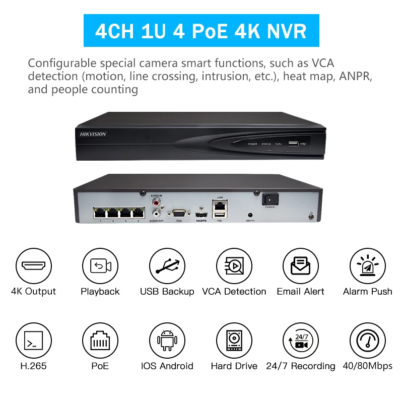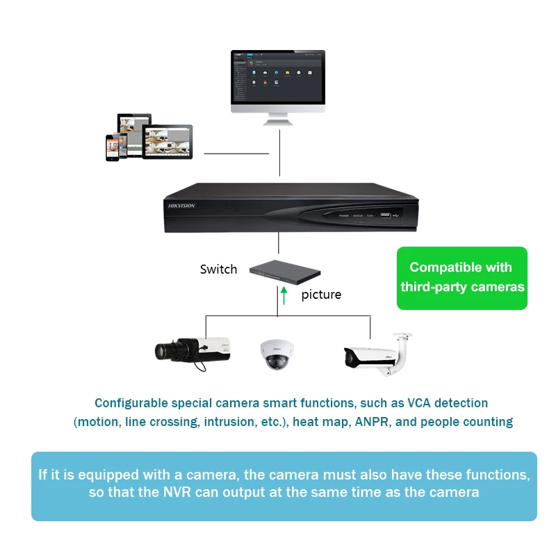 Этот продукт является 100% оригинальным от Hikvision ,NVR настраиваемая специальная камера смарт-функции, такие как обнаружение VCA (motion, Пересечение линии, вторжение и т. Д.), тепловая карта, ANPR, иПодсчет людей
