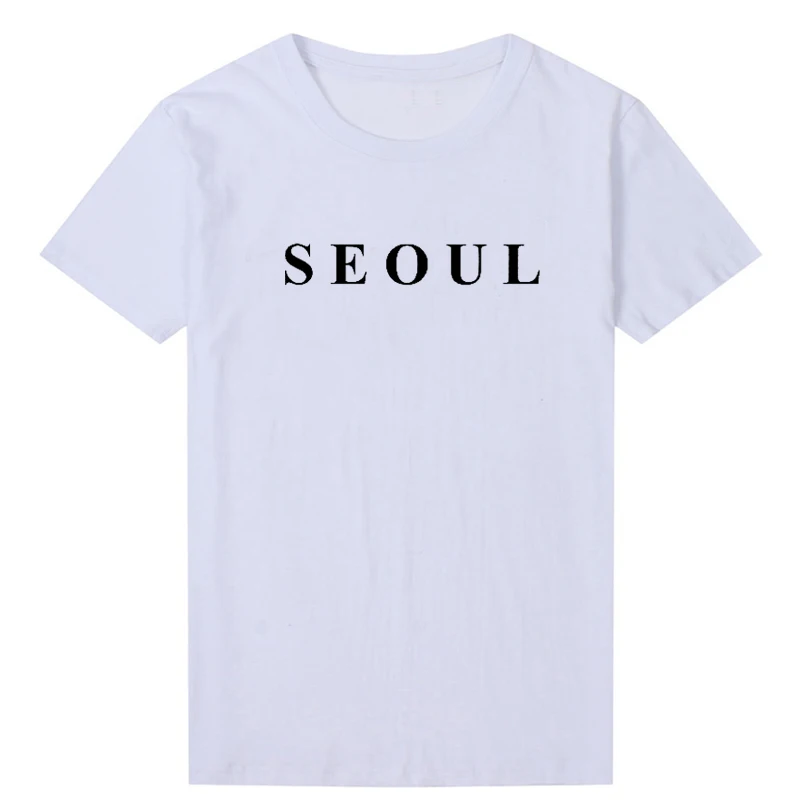 Женские футболки с принтом из сеула и букв, хлопковая Футболка в Корейском стиле с графическим рисунком, белые футболки больших размеров, летние модные женские топы