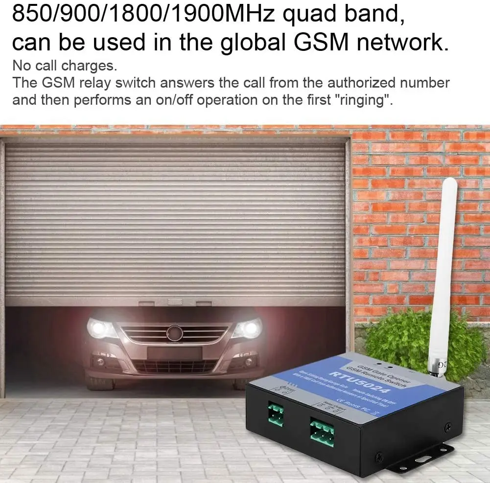RTU5024 GSM открывалка для ворот реле беспроводной пульт дистанционного управления дверной переключатель доступа Бесплатный звонок 850/900/1800/1900 МГцОписание:GSM ворот RTU5024-это мощное GSM реле, которое используется для авторизованного доступа к двери, управления воротами, переключения удаленного оборудования и систем парковки автомобилей. Кроме того, он также может быть использован в местах, которые требуют от вас включить/выключить вашу систему, машины или оборудование удаленно с бесплатным звонком на ваш мобильный телефон.Характеристика:-Добавление или удаление пользователей с помощью SMS текста com mand.-Реле закрывается или время открытия программируется.-Может работать из любого места, без ограничения расстояния.-Четырехдиапазонный, может работать в сетях GSM по всему миру.-Нет необходимости предоставлять пульт дистанционного управления или ключи для разных пользователей.-Безопасное использование идентификатора вызывающего абонента для идентификации, неизвестные абоненты игнорируются.-До 200 авторизованных телефонных номеров можно настроить в указанное время.-Один выход с релейной оценкой 3A/240VAC для подключения выключателя двери или машины.-Несколько применений. (ворота, болты, барьеры, гаражные двери, ставни и двери доступа или машины).-Действие реле вернет подтверждение SMS владельцу или авторизованному номеру вызова, эта функция редактируется пользователем.-Никаких звонков. Реле GSM GPRS отклоняет вызов от авторизованного номера, затем выполняет действие включения/выключения на первом 'кольце'.Спецификация:Частота GSM: четырехдиапазонный 850/900/1800/1900 МГцГигитальный Выход: NC/без сухого контакта, 3A/240 В переменного токаИсточник питания постоянного тока: 9-24 В DC/2AМощность Потребляемая мощность: 12V Вход Макс. 50мА/средняя 25mASim-карта: Поддержка sim-карты 3 вАнтенна: 50Ω SMA Антенный интерфейсДиапазон температур: -20 ~ + 60 ℃Диапазон влажности: Ralative влажность 90%Размеры: 82 мм * 76 мм * 27 мм/3,23*2,99*1,06"Примечание:1. Возможны незначительные отклонения в размере из-за ручного измерения, различных методов измерения и инструментов.2. Изображение может не отражать фактический цвет изделия из-за различных фотографирования светильник, угол и дисплей монитора.