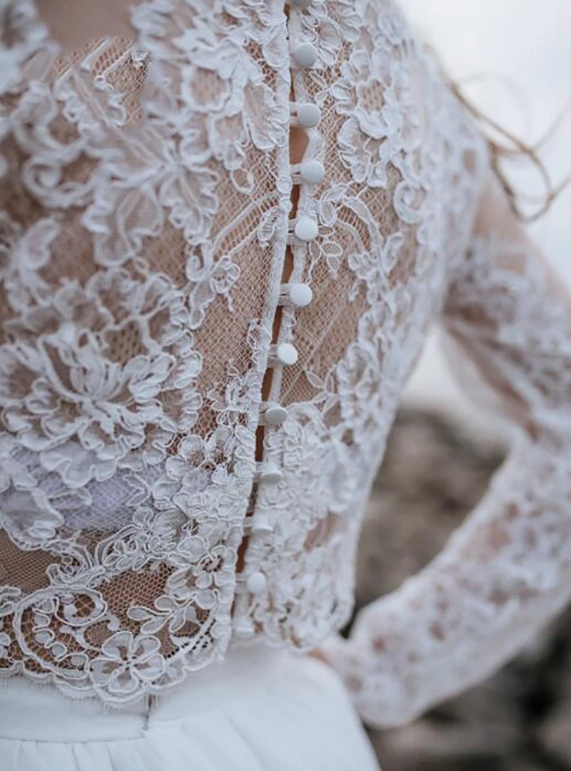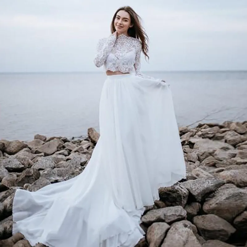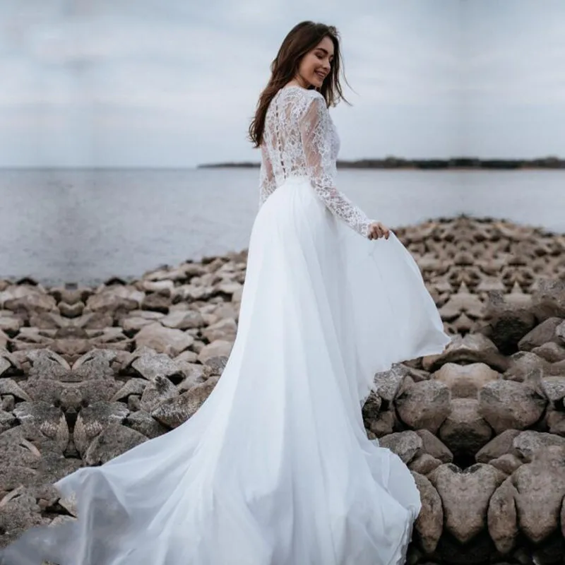 Пляжное свадебное платье с длинными рукавами, шифоновое платье из двух частей, кружевное платье А-силуэта, элегантные свадебные платья в стиле кантри, платье с коротким шлейфом