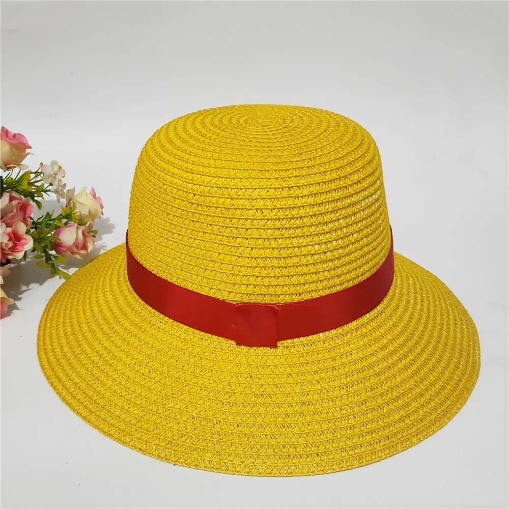Шляпа Luffy женская Соломенная для косплея, Пляжная шапка с широкими полями, с красной лентой, с кружевом, дышащая, с затенением, желтая фермерская Кепка