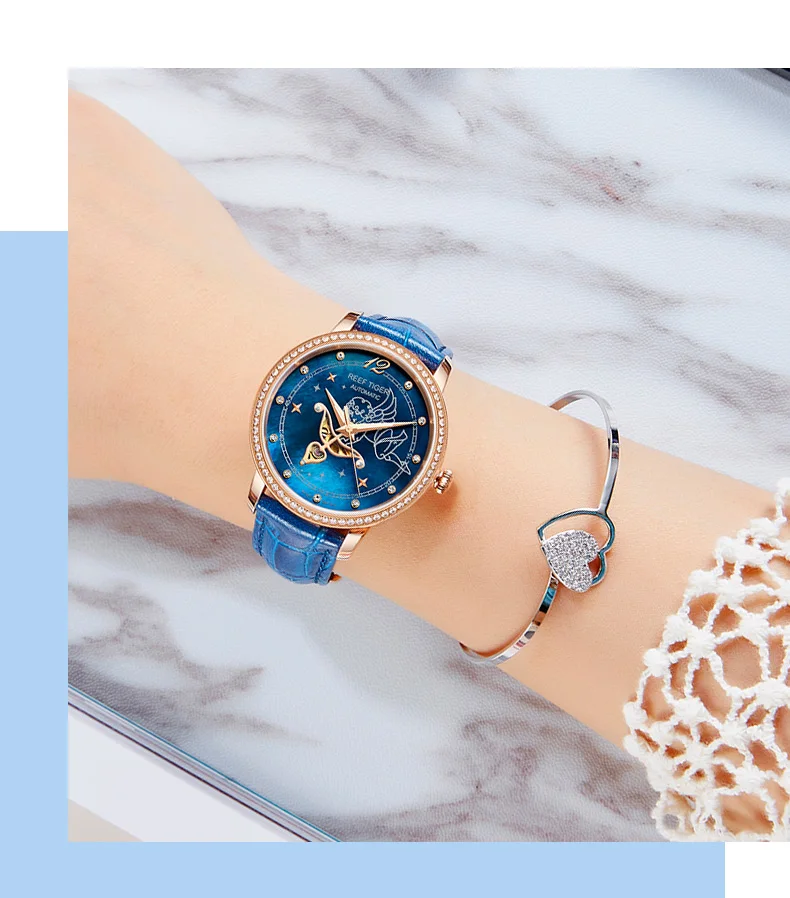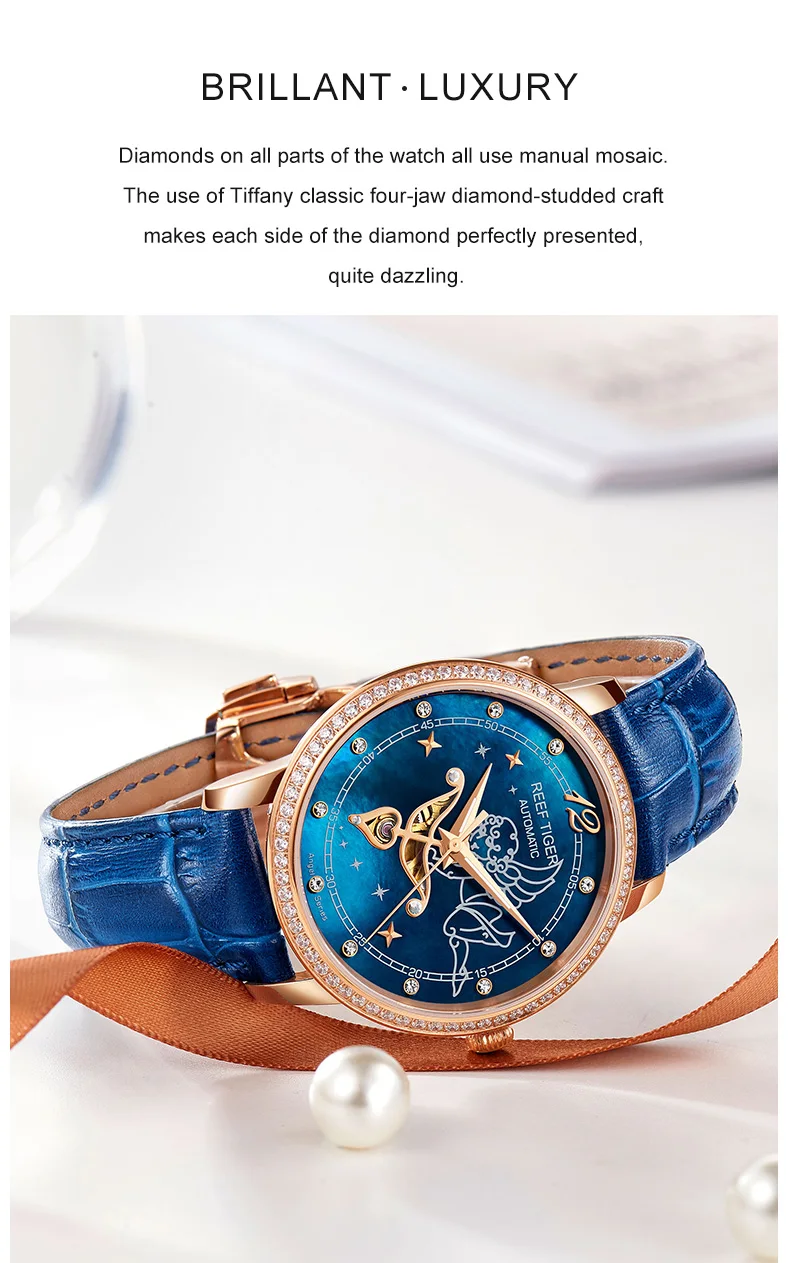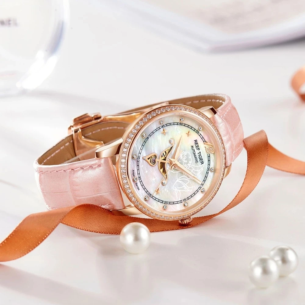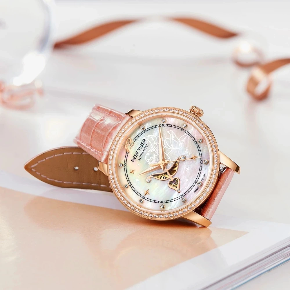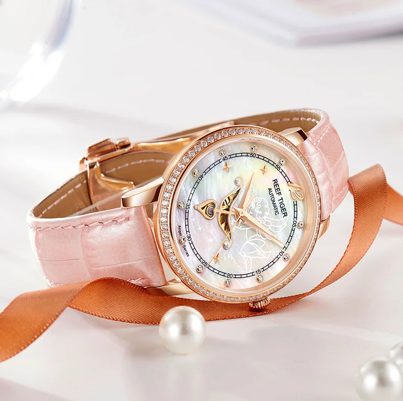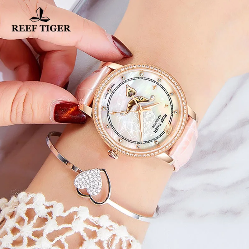 Дизайнерские модные женские часы Reef TigerRT, автоматические механические часы из телячьей кожи с белым циферблатом швабры и бриллиантами