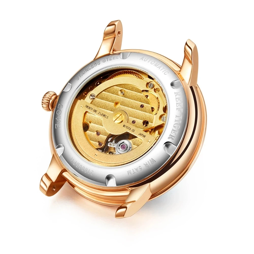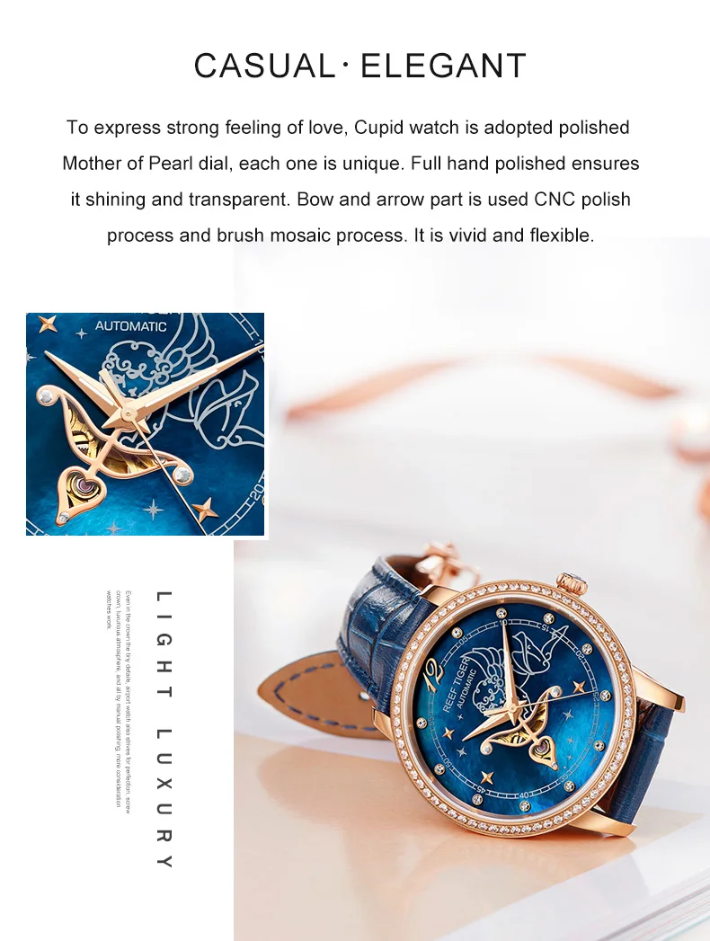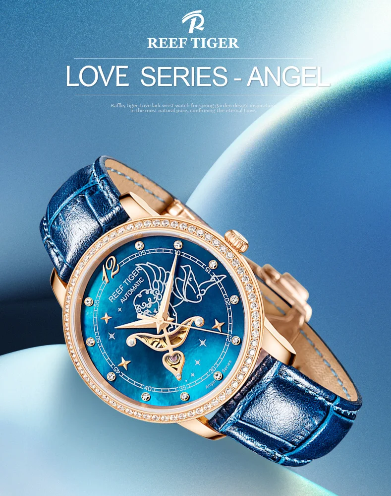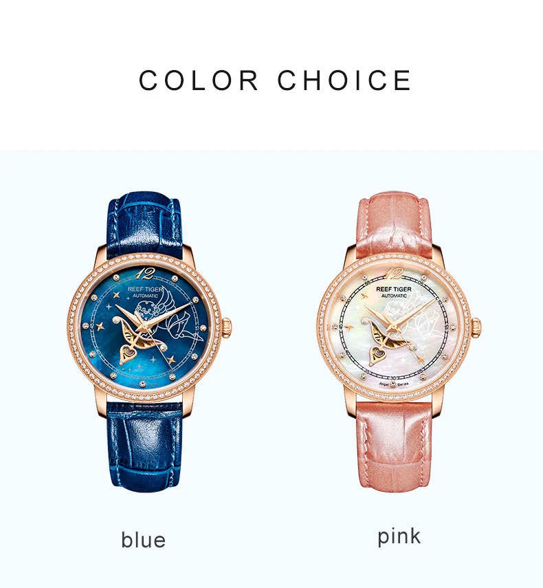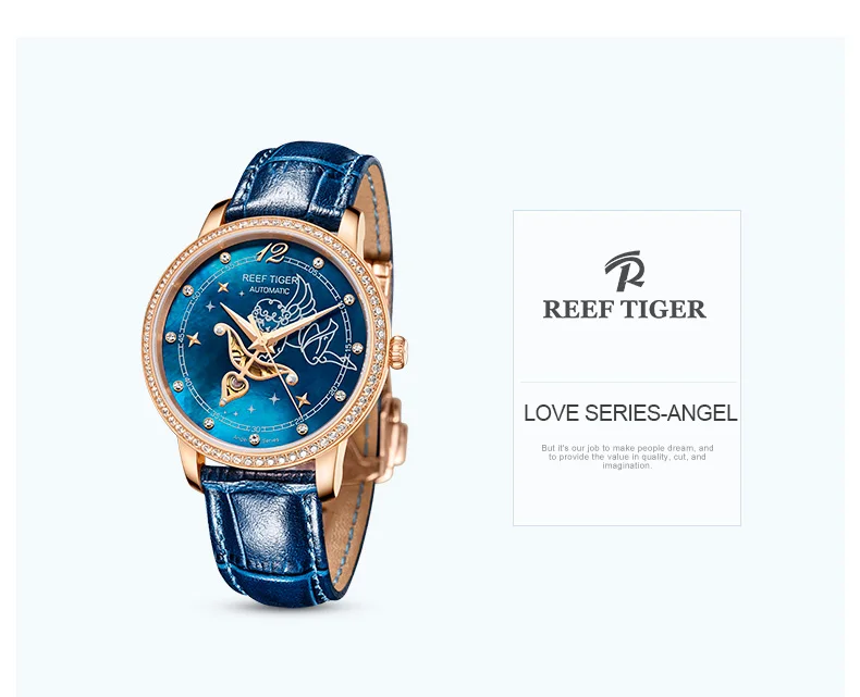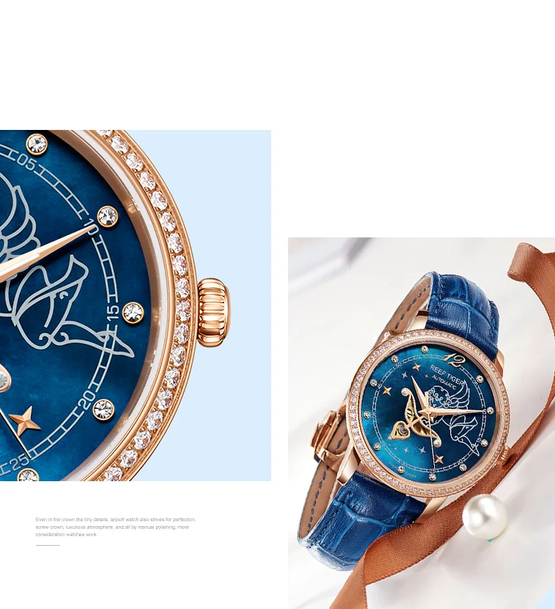 Дизайнерские модные женские часы Reef TigerRT, автоматические механические часы из телячьей кожи с белым циферблатом швабры и бриллиантами