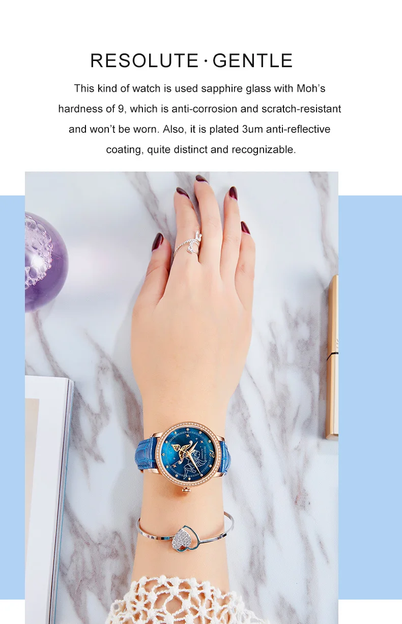 Часы женские, кварцевые, с синим циферблатом, с сапфировым стеклом