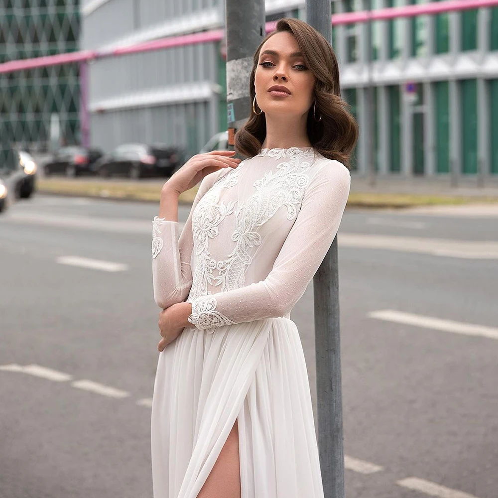 UZN Элегантное свадебное платье, а-образные, круглый ворот, с кружевными аппликациями, одежда с длинным рукавом с открытой спиной Свадебные платья из шифона высоким бортом Разделение платье невесты