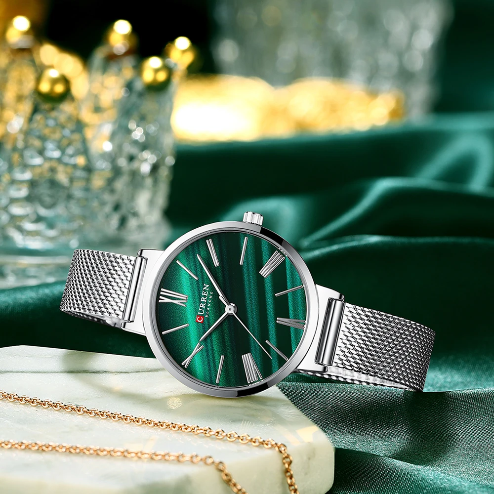 Часы CURREN женские кварцевые из нержавеющей стали, роскошные простые классические элегантные изящные наручные, золотистые зеленые