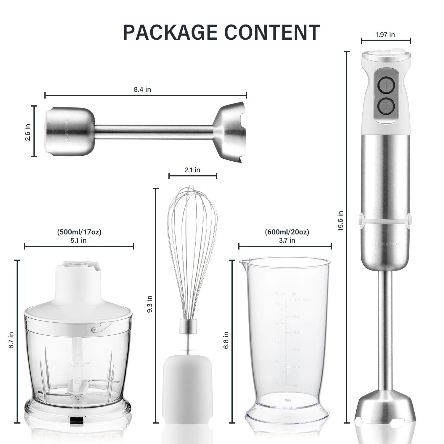Package ContentsImmersion Hand Blender;Egg Whisk;500ml Chopper;600ml Beaker