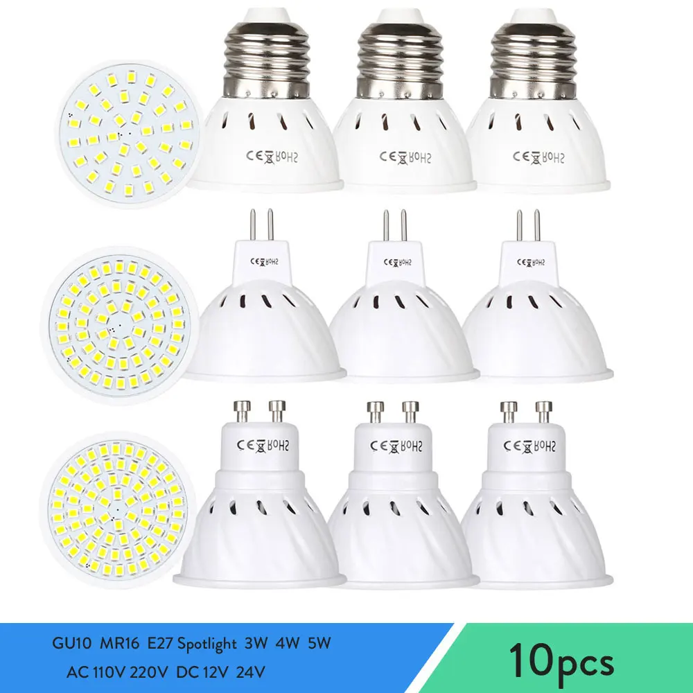 10 шт.лот GU10 3 Вт 4 Вт 5 Вт светодиодный прожектор MR16 лампа Точечный светильник E27 светодиодный lampara bombillas gu 10 2835 свет 12 В 24 в 110 В 220 В