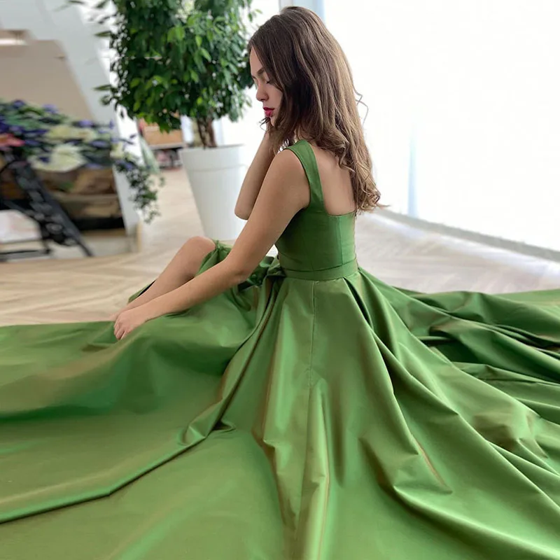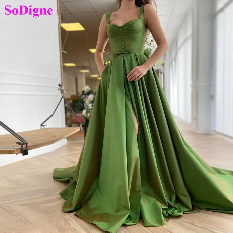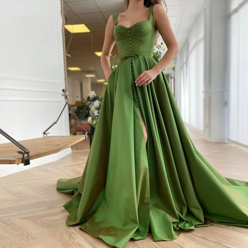 Женское атласное платье-трапеция с открытой спиной, Зеленое Длинное Вечернее Платье с разрезом, на тонких бретелях