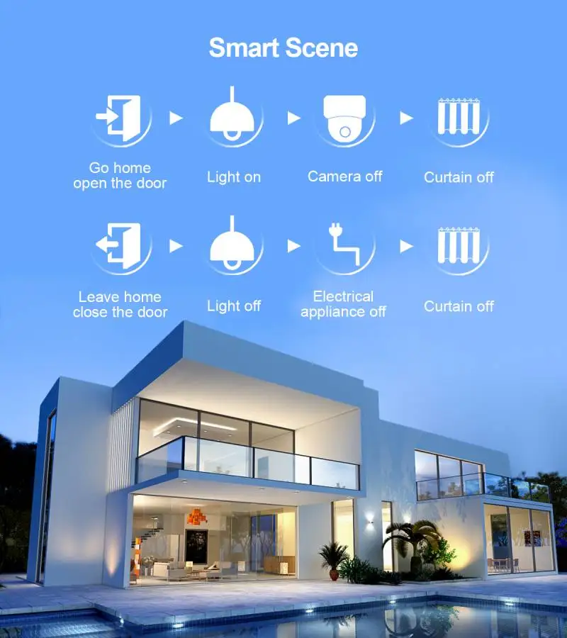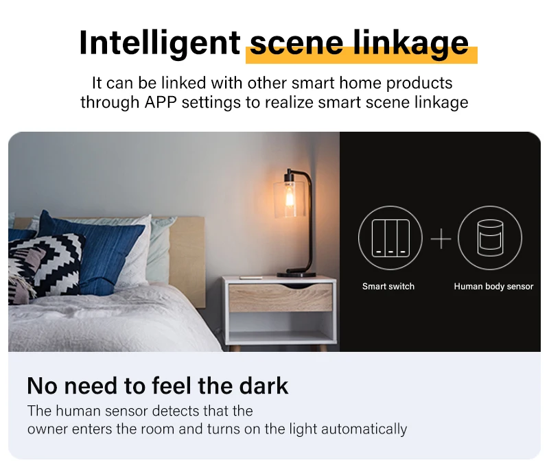 Через настройки, он может быть соединен с другими умными сценами, чтобы сделать жизнь умнее; Например, установите домашнюю сцену: автоматически Включите свет гостиной, телевизор и кондиционер.