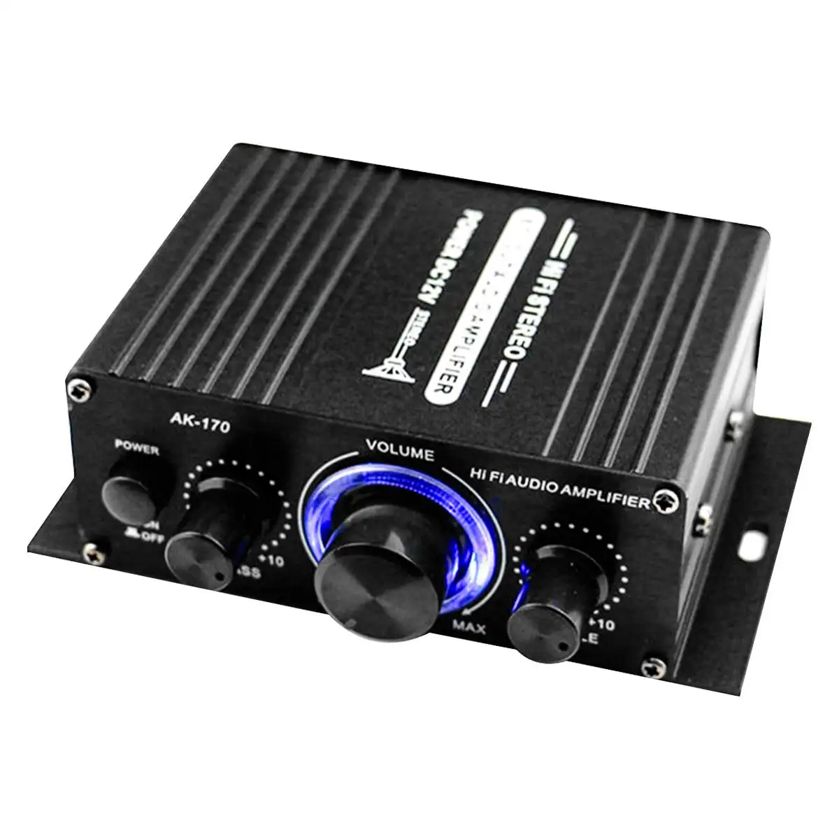 -AK170 (без bluetooth)Характеристики:Модель: AK170Цвет: черныйМатериал: алюминиевый сплавРазмер: 125x75x40 ммВходное напряжение: 12 В постоянного токаМощность RMS: 20 Вт + 20 ВтМаксимальная мощность: 200 Вт + 200 ВтКанал: 2CHСопротивление нагрузки: 4-16 ОмSNR: >90 дБЧастота: 20 Гц-20 кГцКоэффициент искажения: 0.01%Особенности:-Мини-усилитель мощности звука Hi-Fi.-Корпус из алюминиевого сплава, большие ручки спроектированы с синим светом, чтобы сделать товары более красивыми и красивыми.-Низкое Искажение обеспечивает более четкий, мощный и мощный звук.-Два основных канала выходаПосылка1 х усилитель мощности