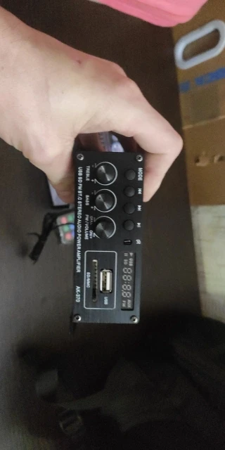 -AK370 (с bluetooth)Характеристики:Модель: AK370Цвет: черныйМатериал: алюминиевый сплавРазмер: 125x75x40 ммBluetooth: поддержкаВходное напряжение: 12 В постоянного тока/220 В переменного тока(Если Входное напряжение составляет 220 В переменного тока. Вам нужно использовать адаптер питания 220 В)Мощность RMS: 20 Вт + 20 ВтМаксимальная мощность: 200 Вт + 200 ВтКанал: 2CHСопротивление нагрузки: 4-16 ОмSNR: >90 дБЧастота: 20 Гц-20 кГцКоэффициент искажения: 0.01%Особенности:-Цифровой мини-усилитель мощности звука Hi-Fi с bluetooth.-Прочный корпус из алюминиевого сплава, один раз корпус сделан из алюминиевого сплава, обработка анодной поверхности, общая атмосфера, толщина, ощущение тоже очень хорошее.-Для SD-карты, U-диска, входа AUX, воспроизведения формата MP3, поддержка беспроводного соединения bluetooth.-Поддерживает FM стерео радио.-Низкое Искажение обеспечивает более четкий, мощный и мощный звук.-С функцией дистанционного управления.-Два основных канала вывода.-Устройство поддерживает работу bluetooth и линейный вход.Посылка1 х усилитель мощности1 х пульт дистанционного управления