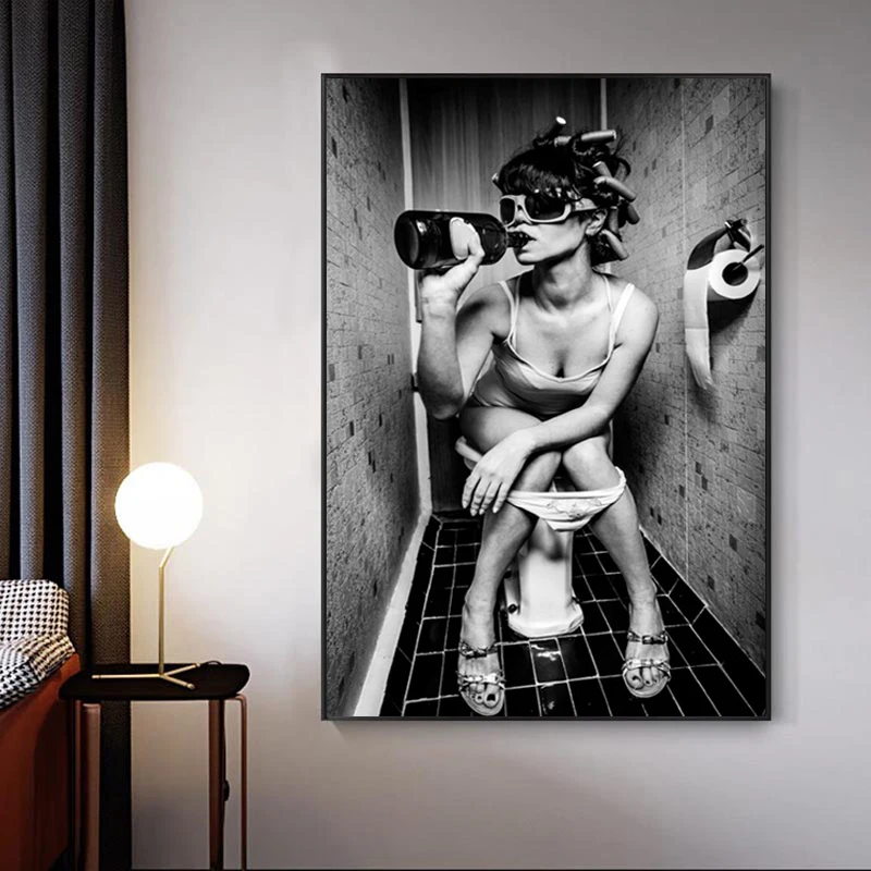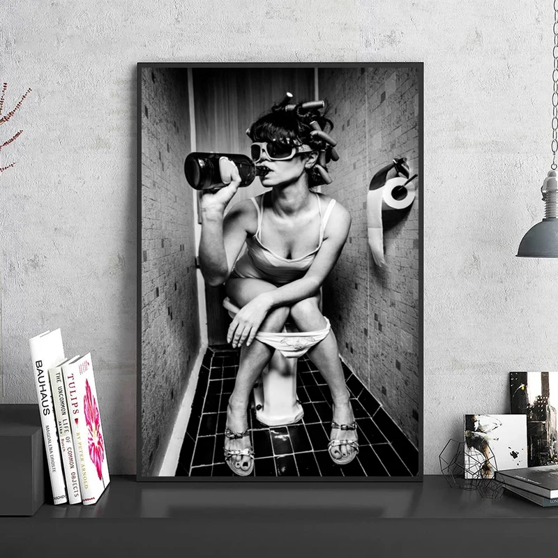 Черно-белая сексуальная девушка курительная Питьевая сидит в туалете холст живопись плакаты и принты стены Искусство женщина картина домашний дизайн
