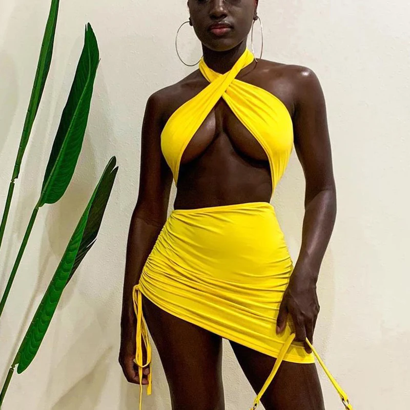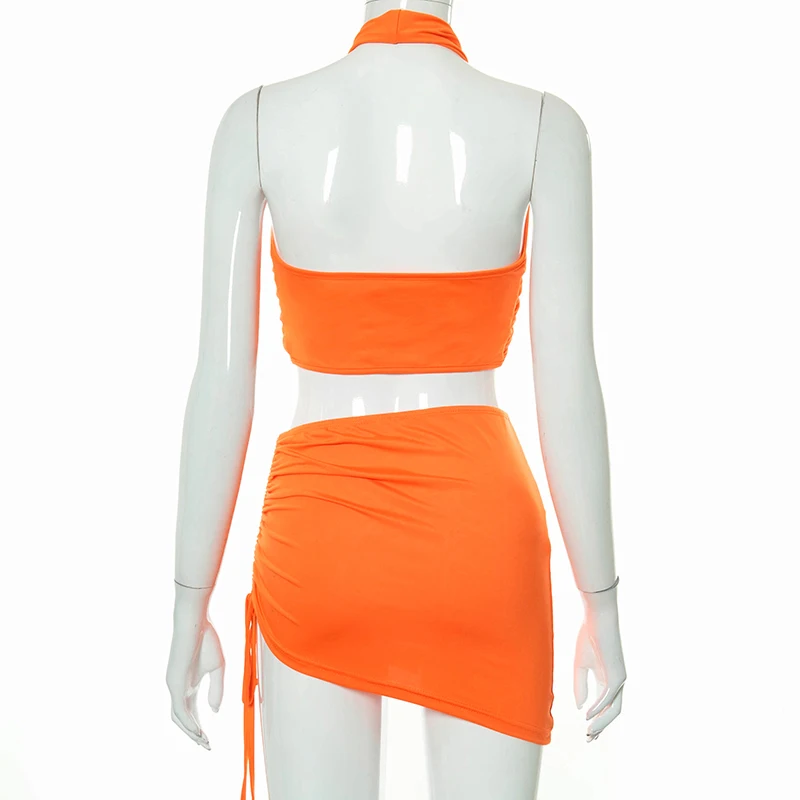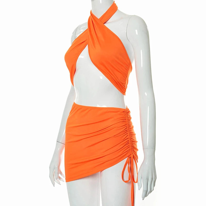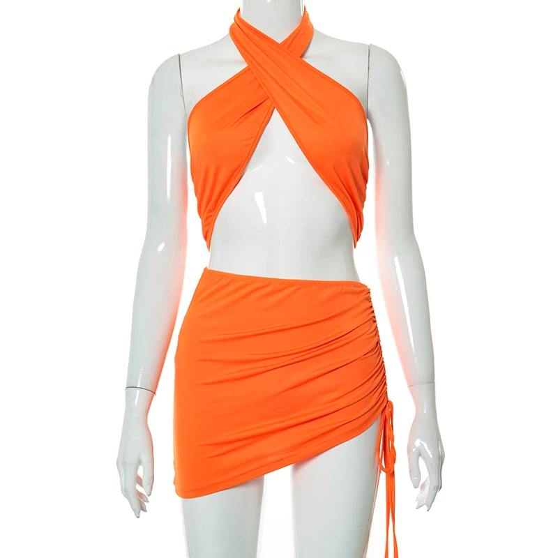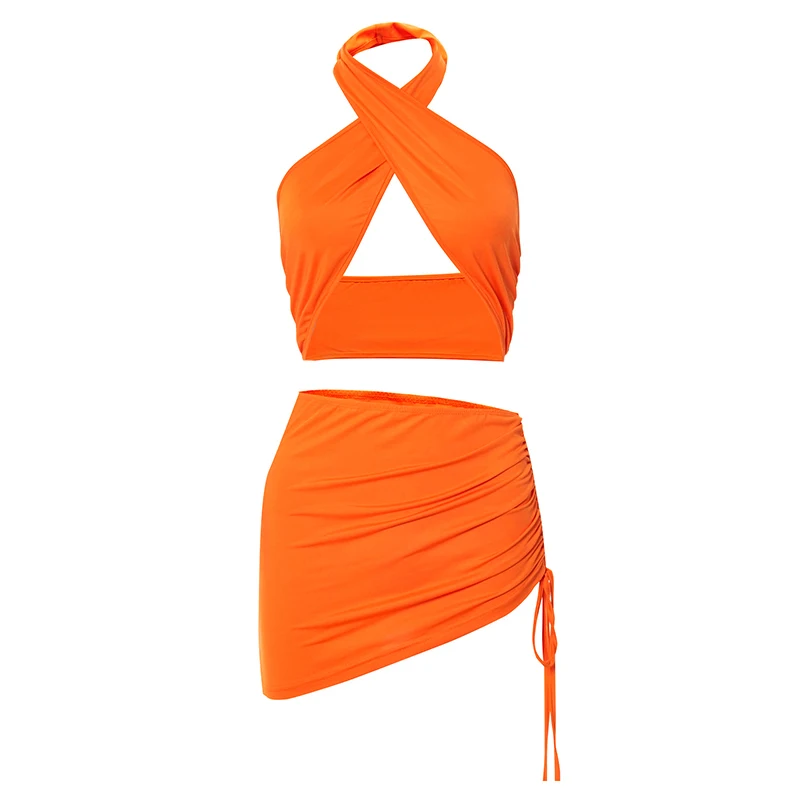 Женский пляжный костюм-двойка, однотонный топ с лямкой через шею и открытой спиной, с асимметричной юбкой, лето 2021