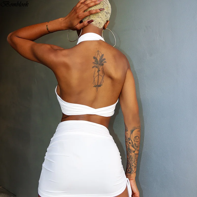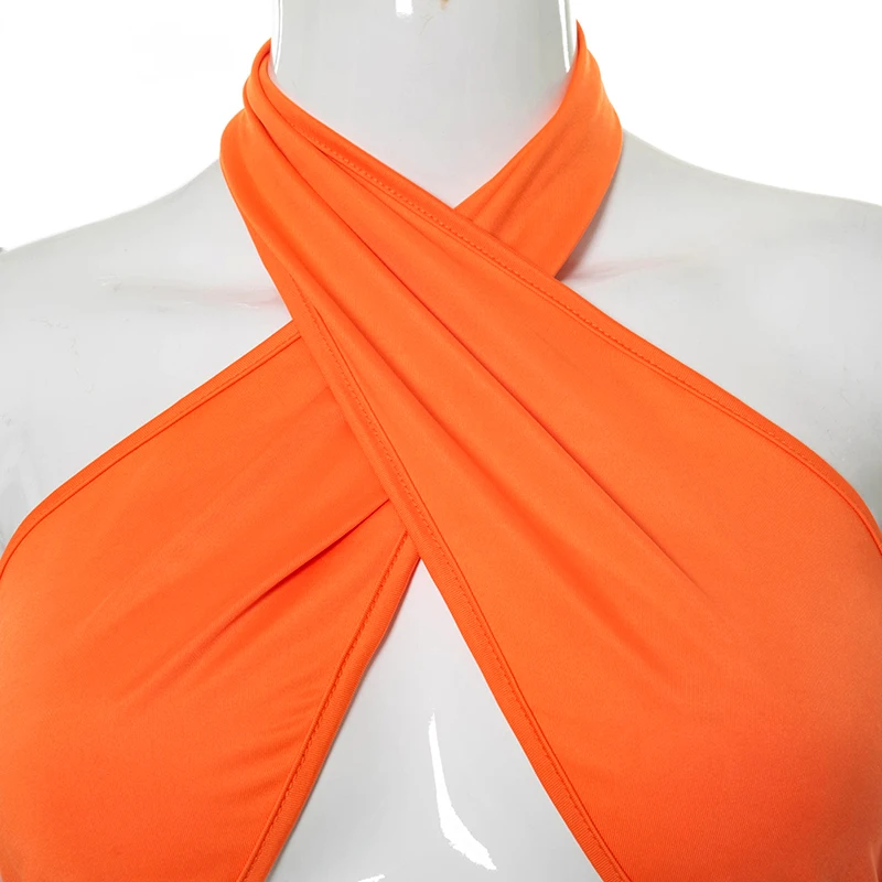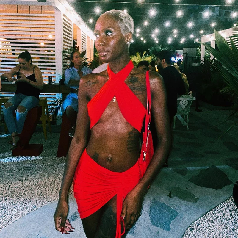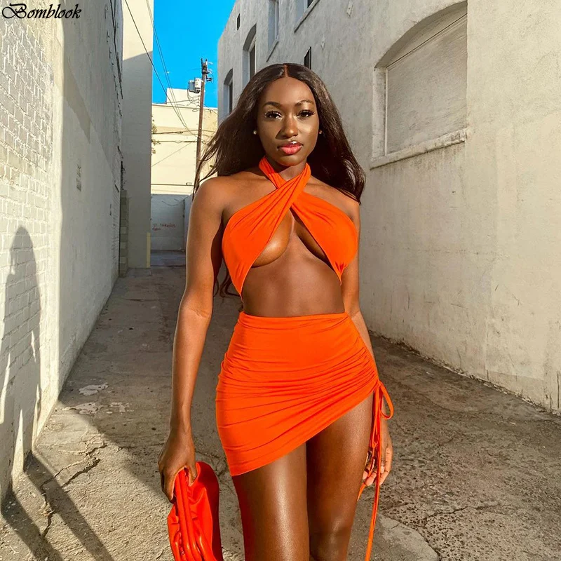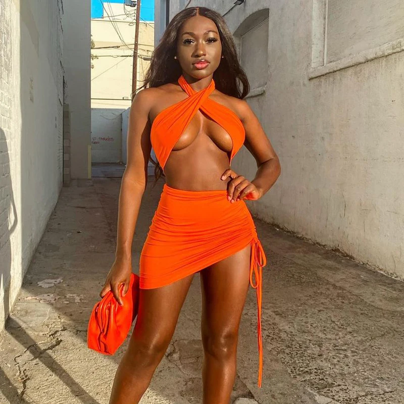 Женский пляжный костюм-двойка, однотонный топ с лямкой через шею и открытой спиной, с асимметричной юбкой, лето 2021