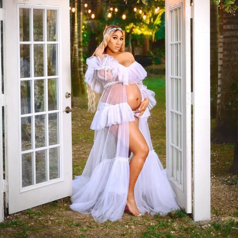 Белое Прозрачное сексуальное Тюлевое платье для беременных для фотосессии с длинными рукавами Свадебный халат тюлевые платья на день рождения с разрезом спереди
