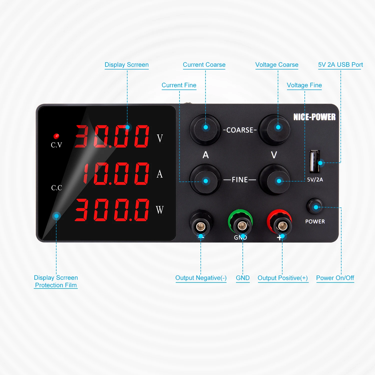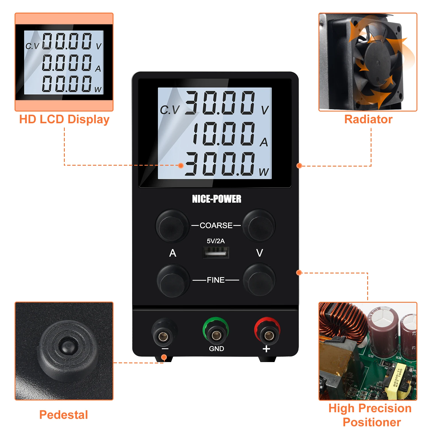 Хорошая мощность 30V 10A постоянного источника питания является профессиональным регулятор мощности с точностью 0,01 V и 0.001A, низкая пульсация DC источника питания. Задняя светильник 4 цифры светодиодный дисплей состоит в том, что оно с высоким разрешением, который может быть отличная видимость даже в условиях низкой светильник условия. Регулируемый источник питания имеет индикатор CV/CC, и постоянное напряжение и режимы постоянного тока можно переключать автоматически