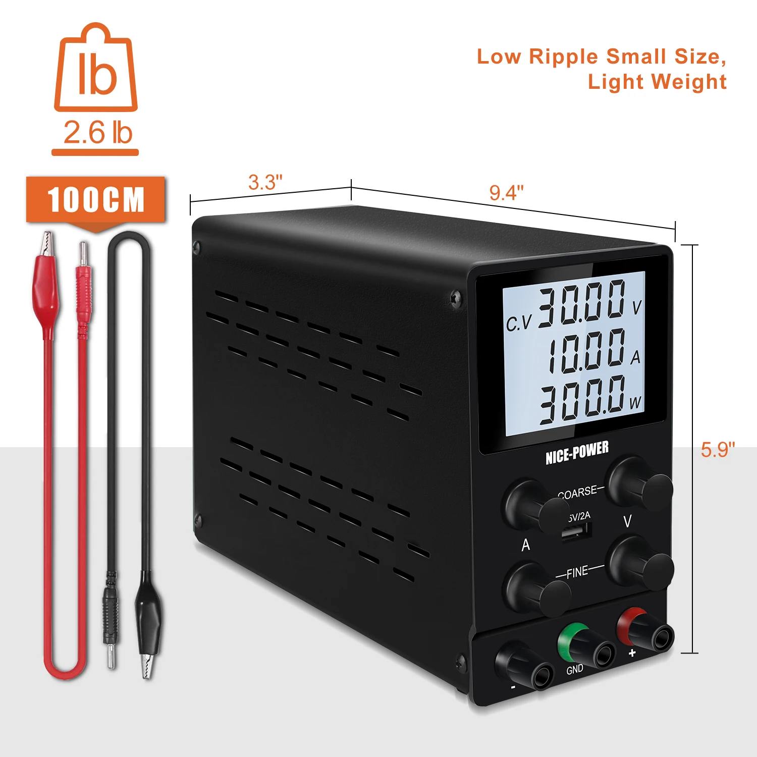 Настольный источник питания имеет стабильную вертикальную конструкцию, а нижняя часть источника питания постоянного тока имеет амортизирующие резиновые ножки, которые более безопасны и стабильны во время использования. Постоянного тока источника питания очень светильник и портативный, с размером 3,3x9,4x6,1 дюймов (примерно 8,4x23,9x15,5 см), весит всего 3,96 фунтов (примерно 1,8 кг). Блок питания постоянного тока может работать легко.
