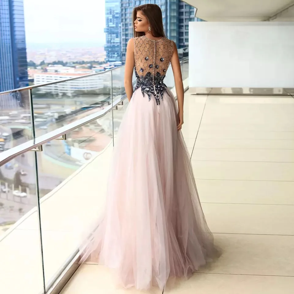 Блестящие вечерние платья-трапеции с бусинами, круглым вырезом, без рукавов, Тюлевое платье до пола на пуговицах, очаровательное вечернее платье для женщин