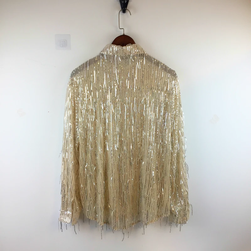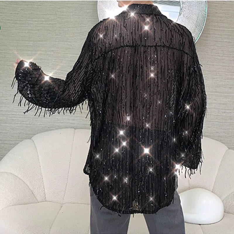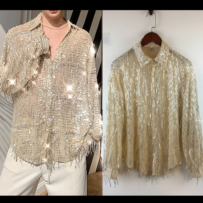 Рубашка мужская с длинным рукавом, прозрачная Свободная блузка с бахромой, с блестками, для танцев и выступлений, цвет золотистыйчерный