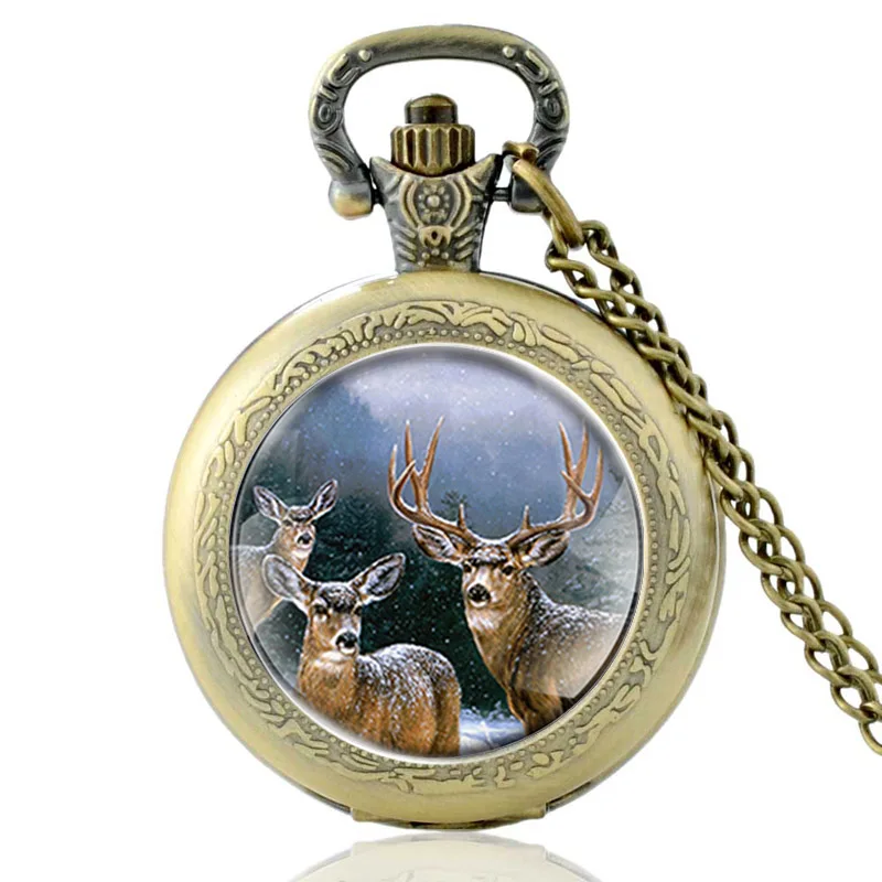 Классические охотничьи олени дизайнерские стеклянные кабошоны кварцевые карманные часы винтажные мужские женские кулон ожерелье цепи часы Ювелирные изделия Подарки