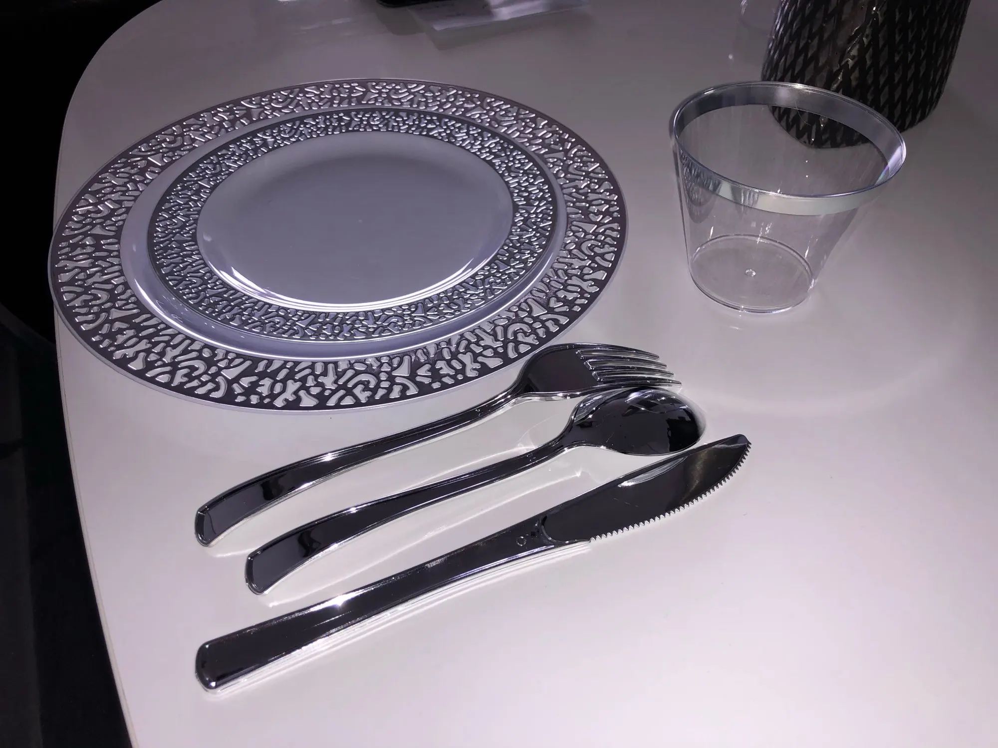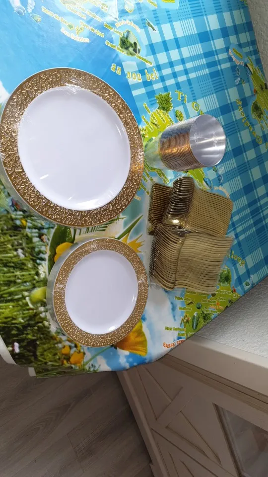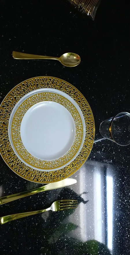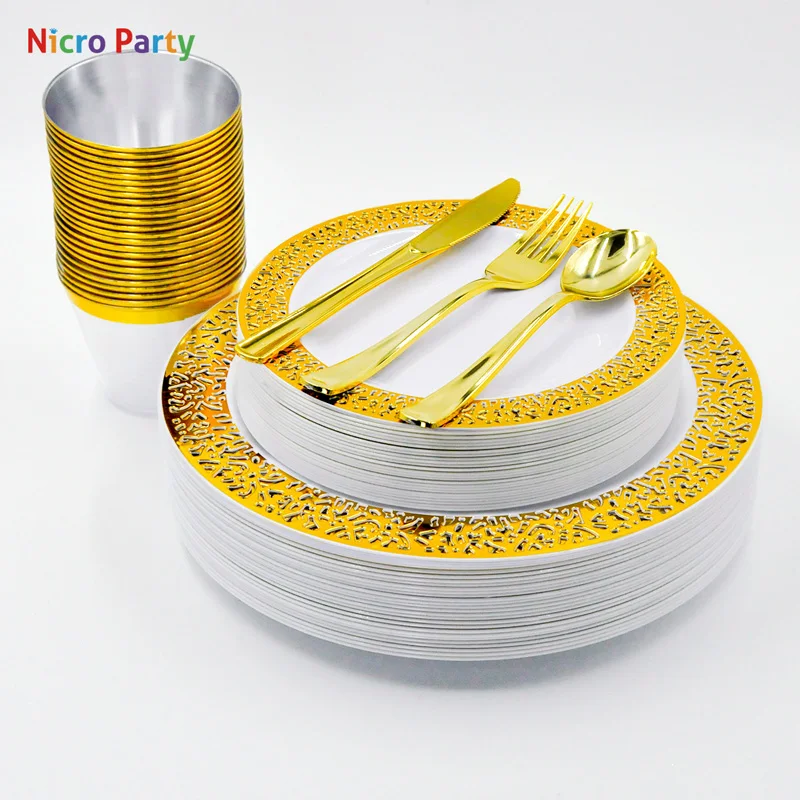 Набор одноразовых тарелок Nicro, 150 шт.компл., серебристые, розовое золото, пластиковые тарелки, вилка, ножи, ложки, прозрачная посуда