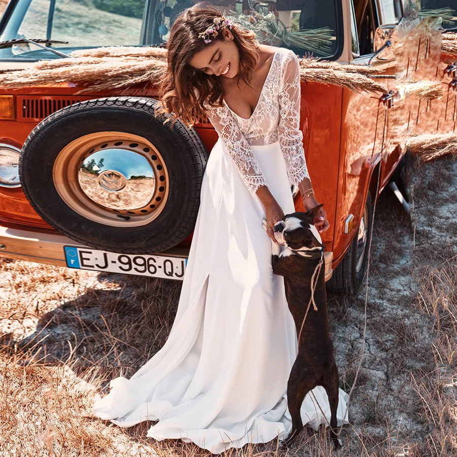 Lakshmigown кружевное свадебное платье в стиле бохо с длинными рукавами, пикантное шифоновое ТРАПЕЦИЕВИДНОЕ ПЛАТЬЕ С V-образным вырезом