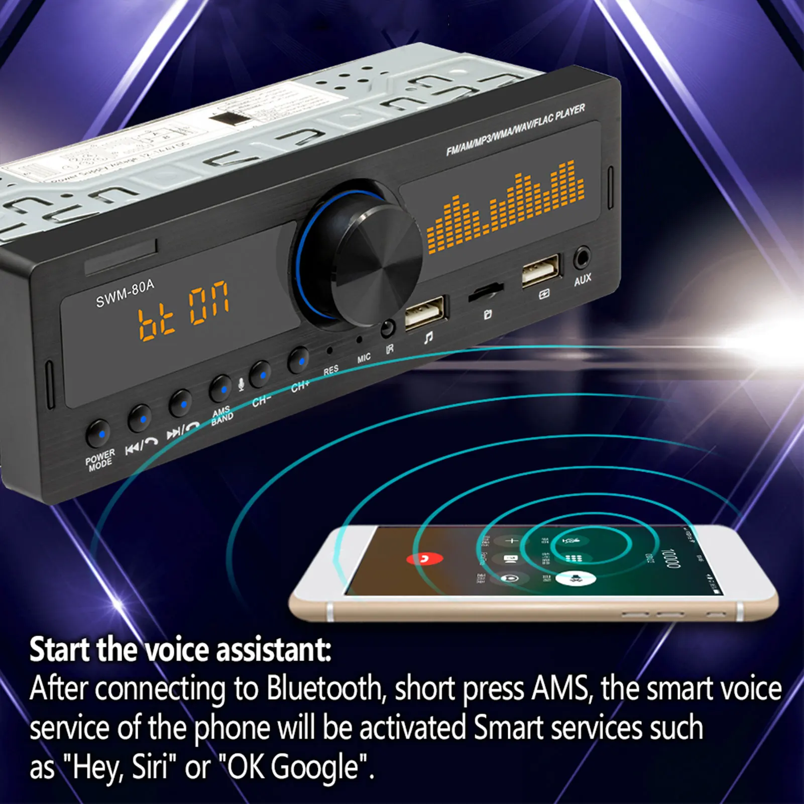 Точки пули:5. Один Din Bluetooth стерео MP3-плеерОсобенности:1. Bluetooth для воспроизведения музыки Bluetooth для совершения и приема звонков и функции AUX.2. Цифровое высококачественное FM/AM стерео радио.3. Поддержка картридера и u-диска (аудио).4. Поддержка аудио: MP3/WMA/WAV/FLAC.5. Аудиовыход RCA может быть подключен к сабвуферу.6. Красочные прохладные огни.7. Функция копирования аудио, поддержка записи источника звука, вы можете Непосредственно копировать радио-и AUX музыку и Bluetooth на U-диск.8. Поддерживает мобильный телефон, приложение, местоположение и функцию поиска автомобиля, голосовое управление, мобильный телефон, голосовой помощник.Характеристики:Тип: автомобильный стерео MP3-плеерСпециальная функция: FM /AM радио, Bluetooth, Hands-free Звонки, mp3-плеер, AUX, двойная USB зарядка,Модель: SWM-80AНапряжение: 12 ВОС: нетПрограммное решение: SWT6D801Чип усилителя: TDA7388Тип экрана: светодиодный цифровой трубка + экран частотыРазмер панели (около): 188*58 мм/7,40*2,28"Панельный светильник: Красочный переменный светильникРазмер коробки (около): 220*82*181 мм/8,66*3,23*7,13"Глубина хоста: 60 ммВес одной машины (около): 418 гРадио диапазон: FM 87,5 ~ 108 МГц/A522 ~ 1620 кГцРадиочип: ZT0811Мощность: 4*60 ВтSNR (дБ): ≥ 60 дБСтепень искажений (%): ≤ 0.3%Чувствительность: менее 20 дБСтерео разделение: более 25 дБРабочая температура: -10 ~ 60 ° CМодель Bluetooth: AUTO BTВерсия Bluetooth: 4,0Слот для tf-карты: ДаПульт дистанционного управления: ПоддержкаИнтерфейс USB и версия: USB2.0Кнопка: Физическая кнопкаRca-клеммное введение: 4-канальный аудио выходAUX аудио вход: ДаПоддерживаемые Аудиоформаты: MP3 / WMA / WAV / FLACУпаковочный лист:1 х mp3-плеер1 х шнур питания1 х Акустический кабель2 x ключ для удаления1 пульт дистанционного управления1 х РуководствоПримечания:1. Этот продукт является машиной 12 В, не в соответствии с источником питания 24 В.2. Возможны незначительные отклонения в размере из-за ручного измерения, различных методов измерения и инструментов.