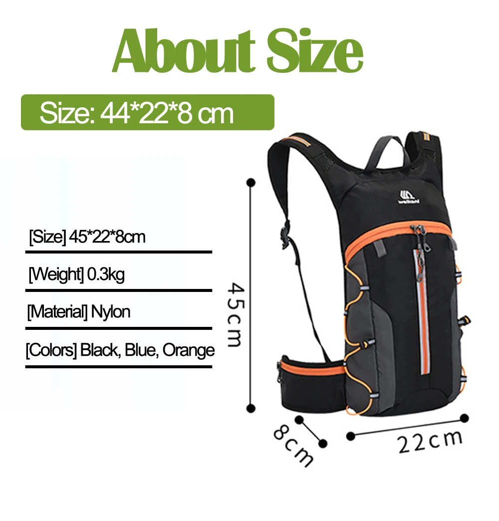 Спецификация: Материал рюкзака: нейлон Цвет: черный/зеленый/оранжевый Емкость: около 10 л Вес: около 300 г Размер: 45*22*8 см Сцены: Велоспорт, альпинизм, путешествия, туризм и так далее
