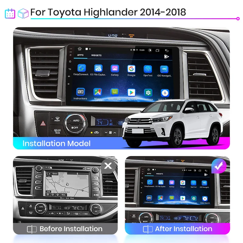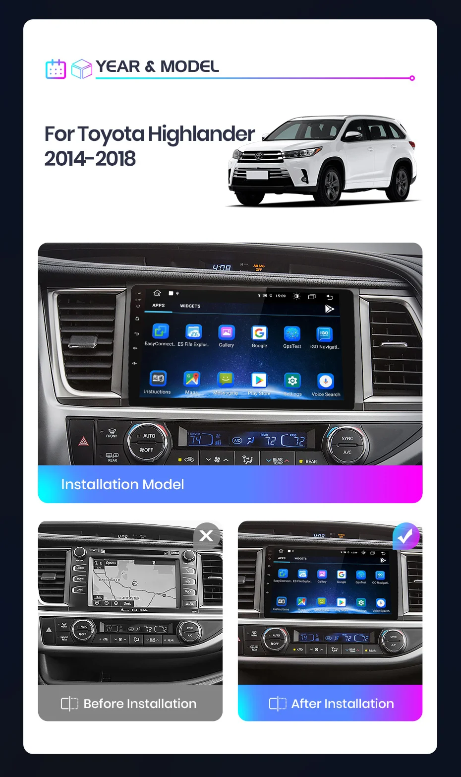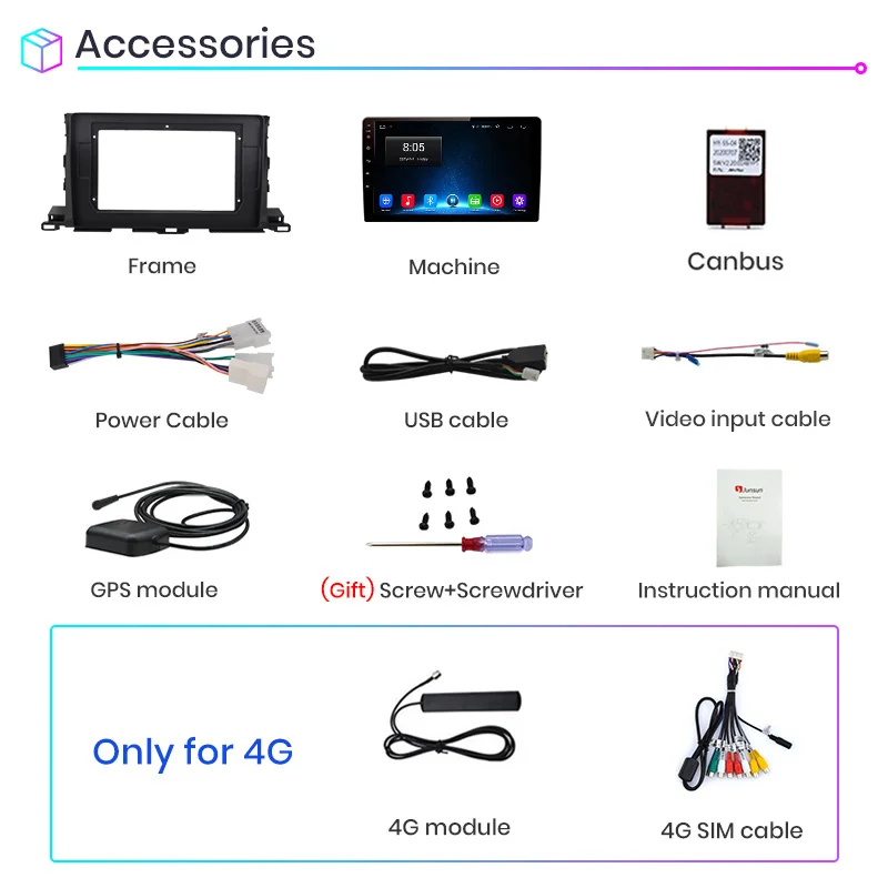 > Junsun V1 для Toyota Highlander 2014-2018 функция10 дюймов 2.5D емкостный экран + 1,2 ГГц четырехъядерный процессор + DDR3 1 Гб (2 Гб опционально) флэш + 16 Гб памяти (32 Гб опционально) + Встроенный Wi-Fi (сеть 4 Гб опционально) + gps-навигация (Обновление карты, только поддержка бренда Junsun) + Управление рулем + зеркальное отображение + Bluetooth + Встроенный микрофон + FM / AM + RDS (опционально) + Поддержка функции USB ADAS DVR + Функция Europe DAB + 1080P Vedio Play + HD 1024*600 + Система контроля давления шины> Язык экранного менюРусский, английский, испанский, итальянский, французский, немецкий, китайский, эстонский, польский, филиппинский, финский, корейский, голландский, хорватский, латышский, литовский, румынский, норвежский, португальский, японский, шведский, тайский, турецкий, украинский, венгерский.> 24 ч * 7 сервисная поддержкаВ Junsun Наша цель-продолжать усердно работать, чтобы создать инновационное автомобильное мультимедийное радио оборудование и программное обеспечение, которое дает вам личный контакт.Мы предоставляем бесплатные обновления для прошивки, программного обеспечения, gps-навигационных карт.