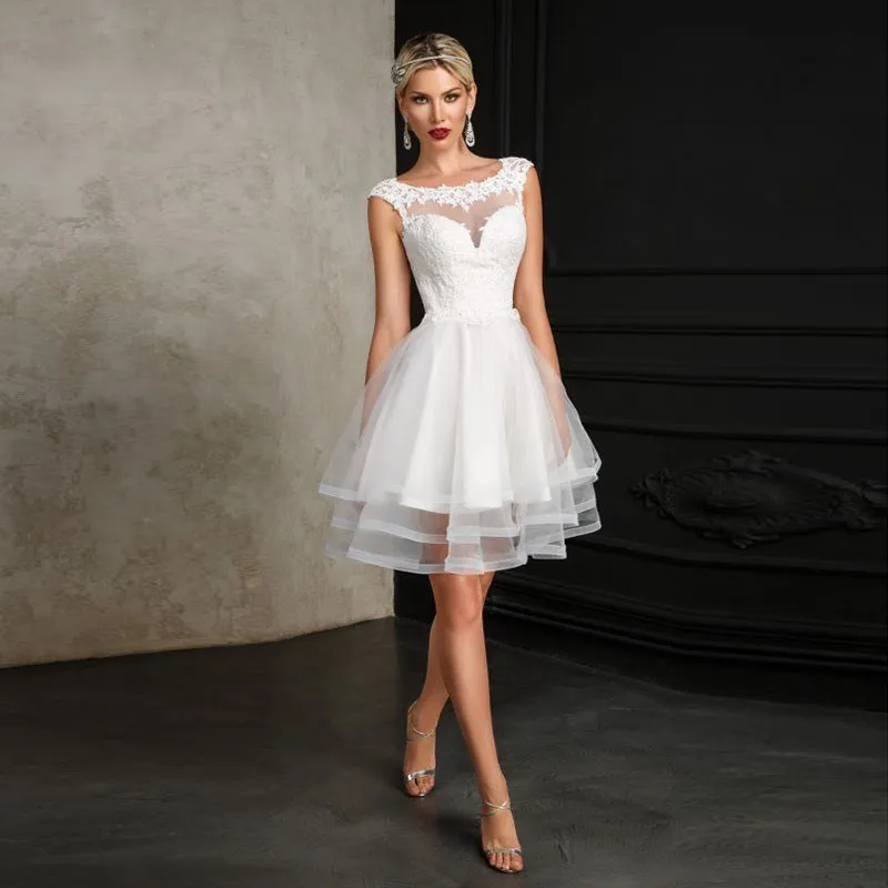 Женское Короткое свадебное платье It's yiiya, белое ТРАПЕЦИЕВИДНОЕ ПЛАТЬЕ до колена с круглым вырезом, аппликацией и открытой спиной на лето 2019