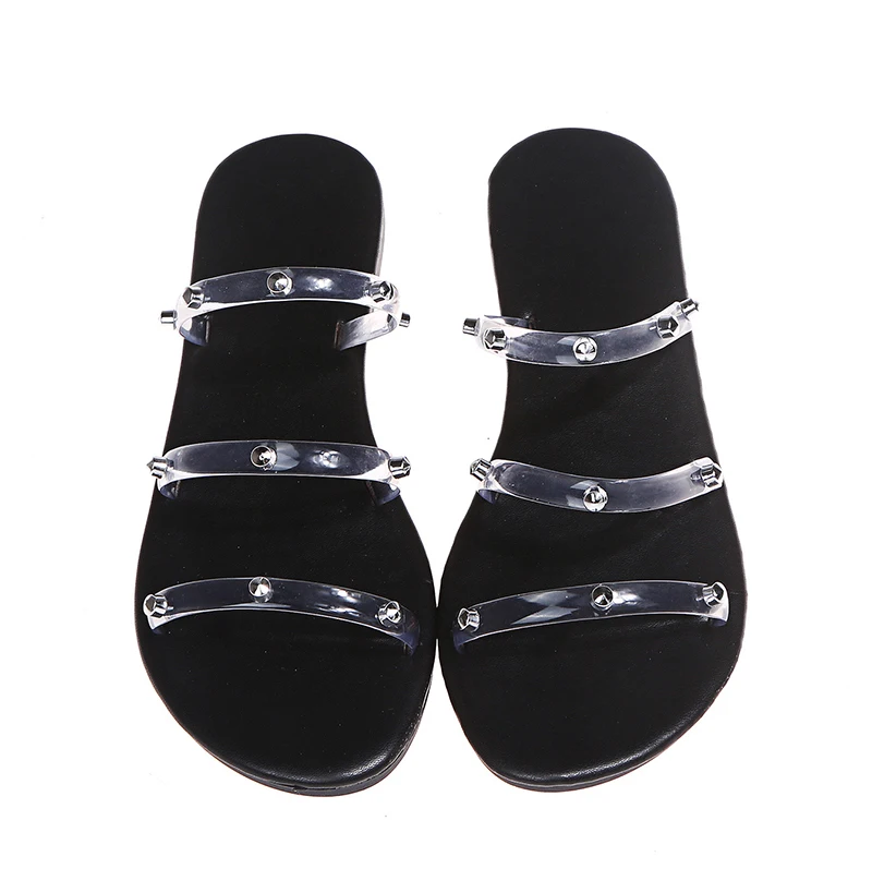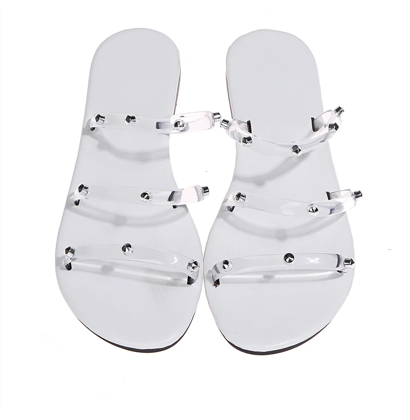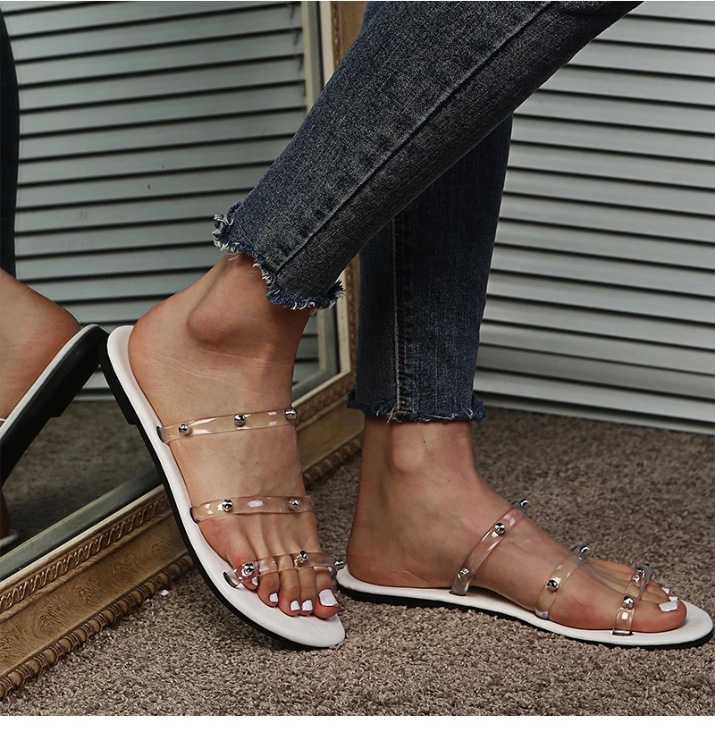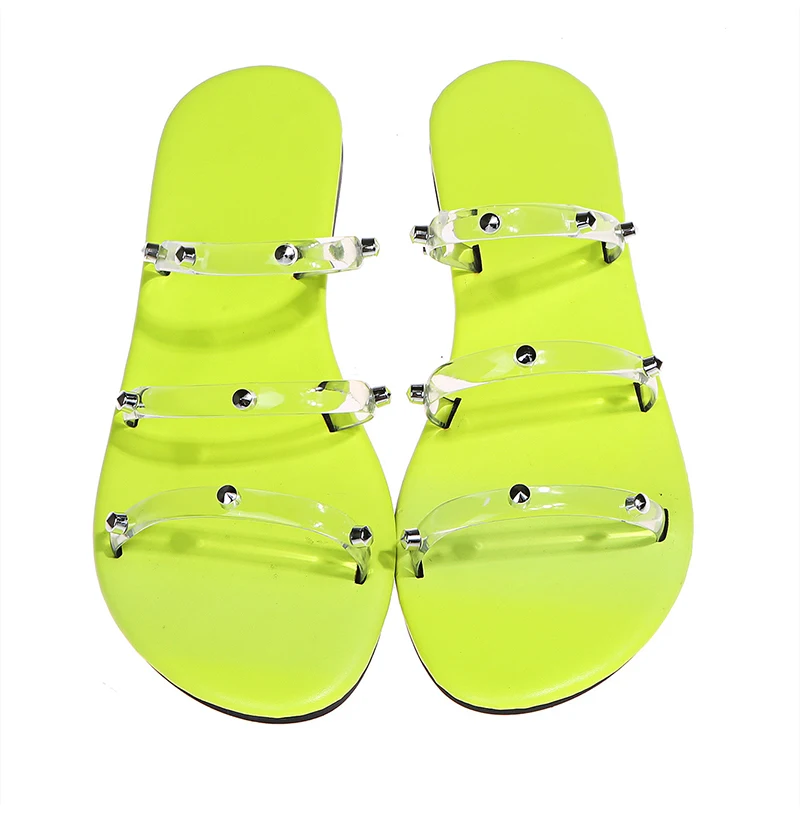 Тапки женские прозрачные с заклепками, флуоресцентная обувь на плоской подошве, сланцы, пляжная обувь, размера плюс, лето