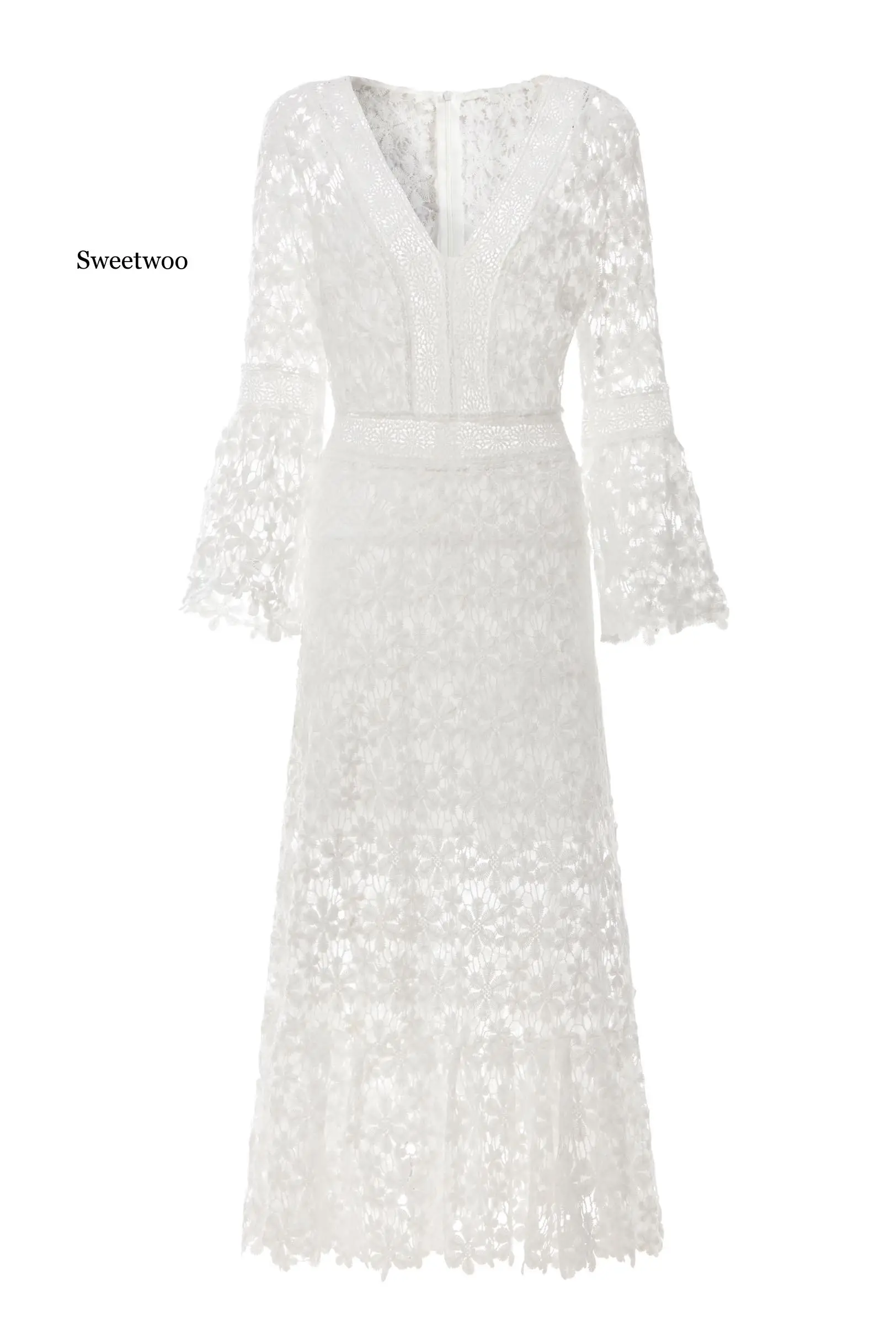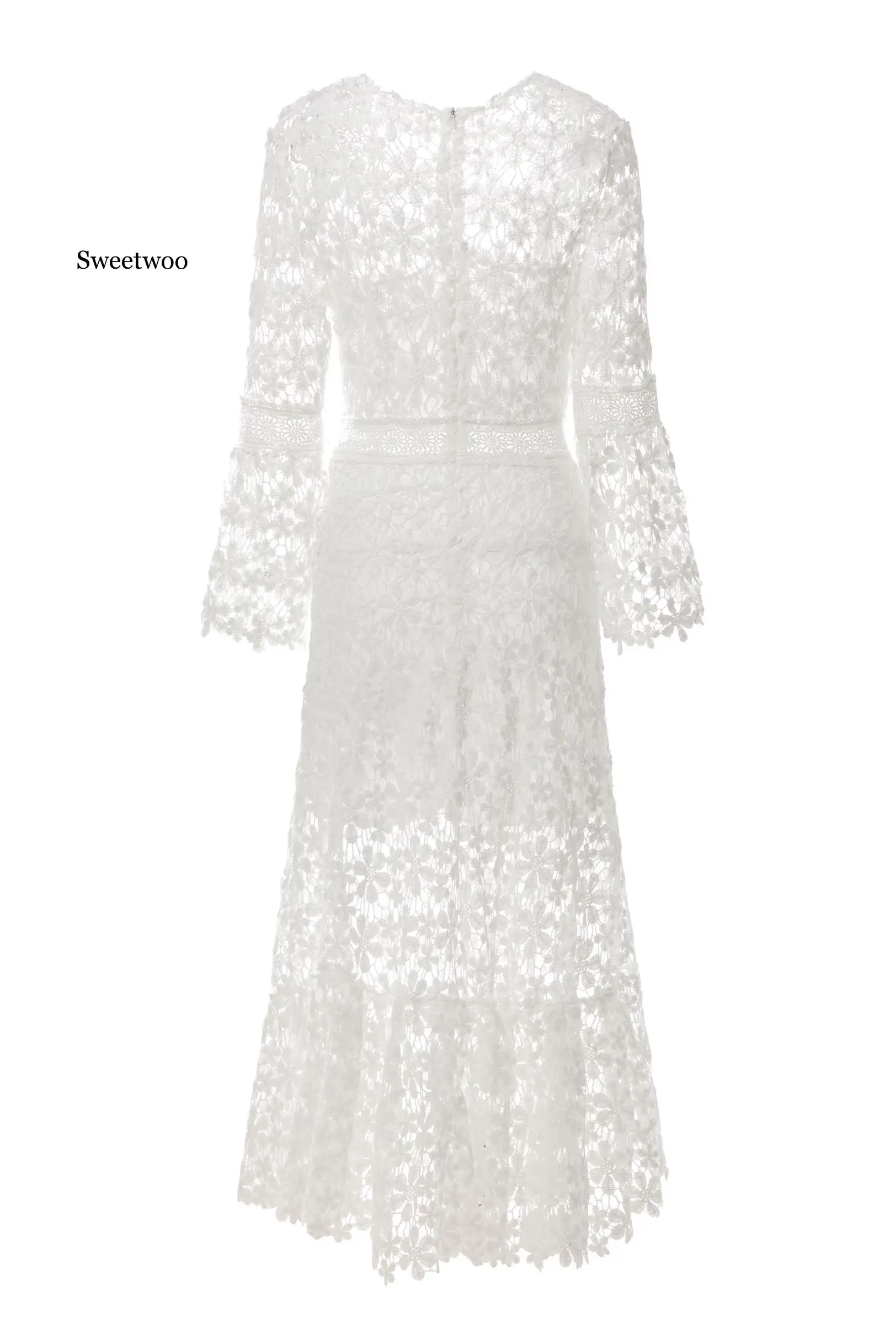 Платье женское кружевное с V-образным вырезом, белое пикантное длин...