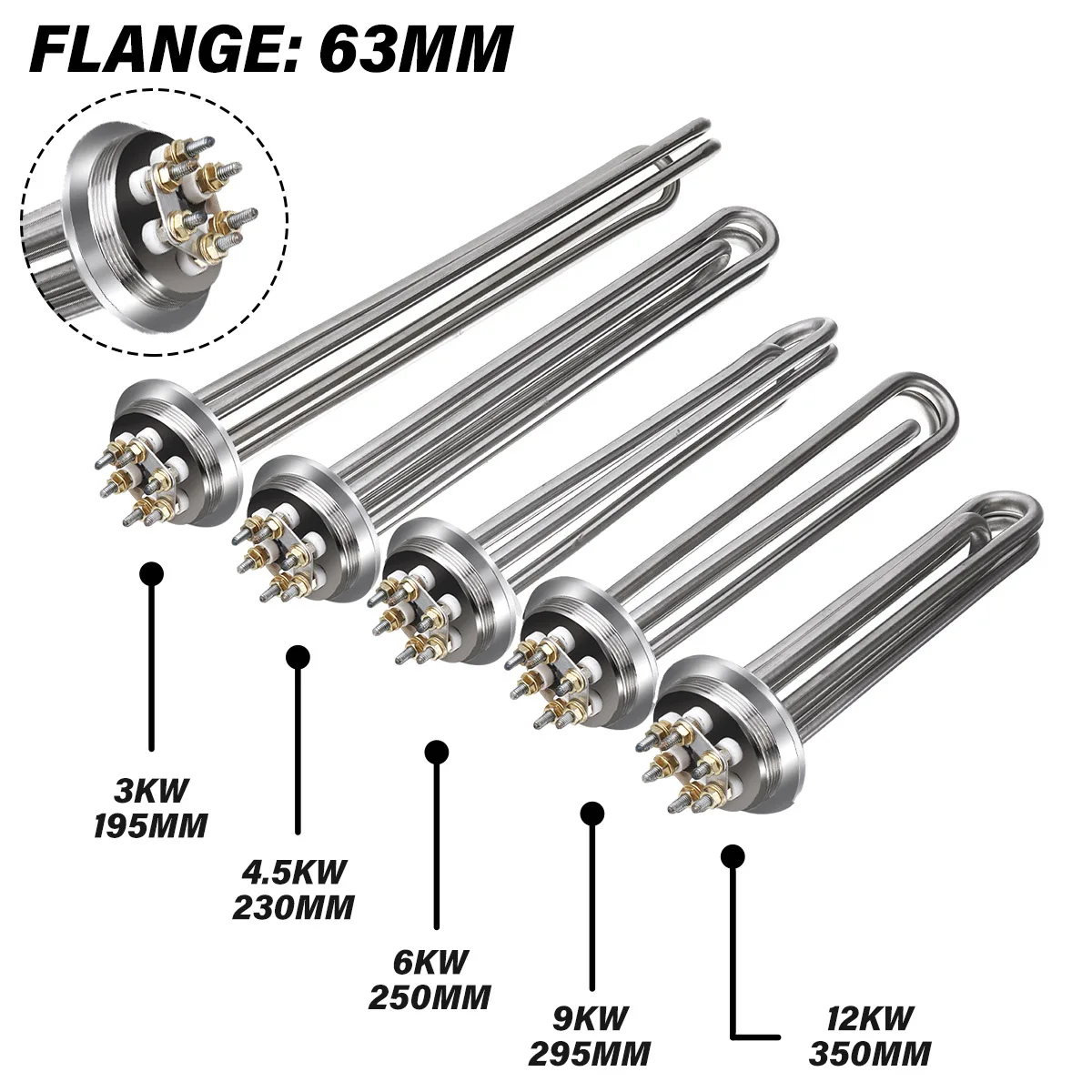 Погружной электрический нагревательный элемент с тремя зажимами (OD63), 2 дюйма, 220 В, все 304SUS, водяное масло, 63 мм, нагревательная трубка с фланцем