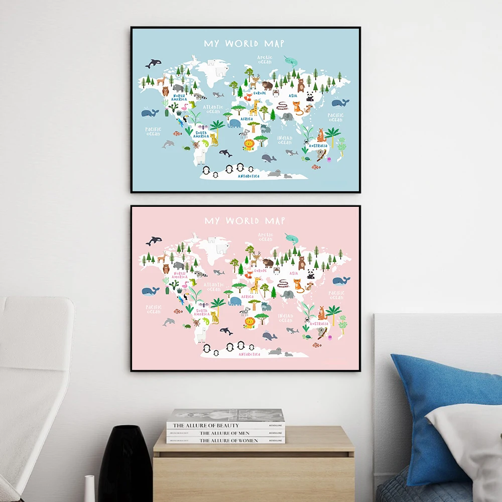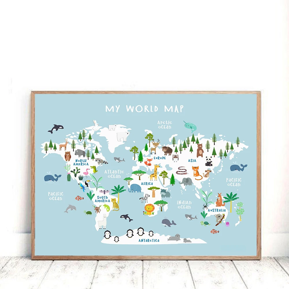 Лесных животных Карта мира Плакат Художественная Печать Детские Декор акварель Развивающие детские холст для живописи стена детской комнаты искусства