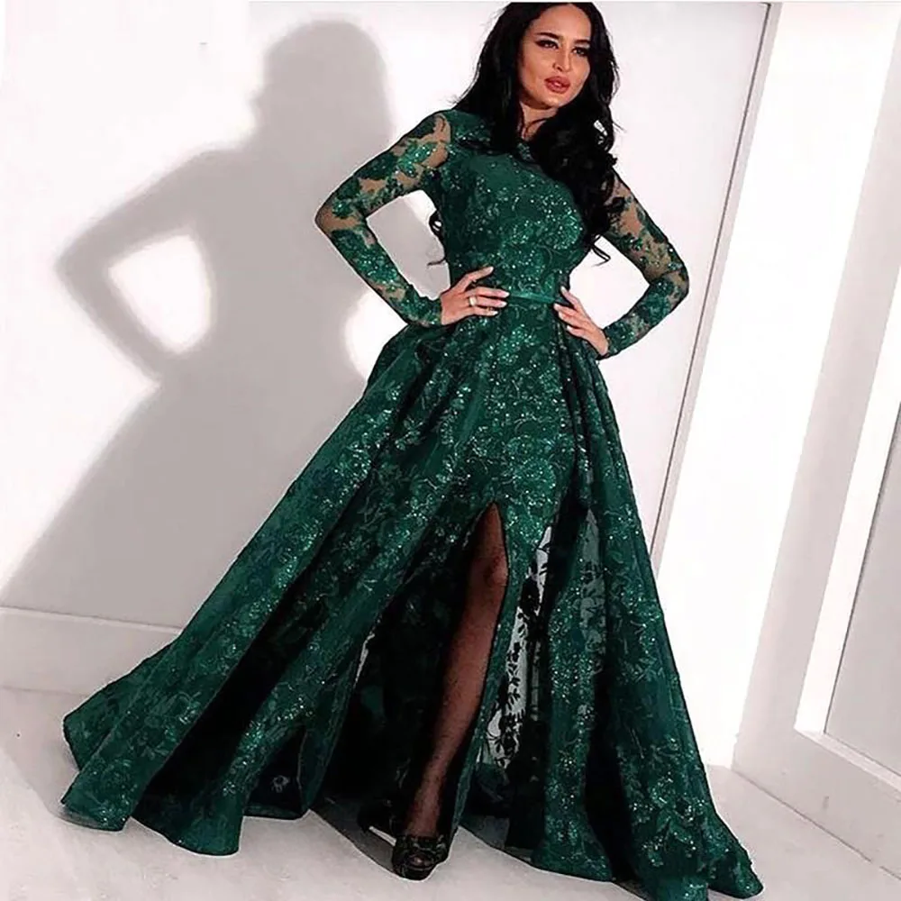 Сверкающие одежда с длинным рукавом Разделение развертки Поезд Формальные Вечерние платья Арабский Дубай Роскошные изумрудно-зеленое на шнуровке Длинные вечерние платья