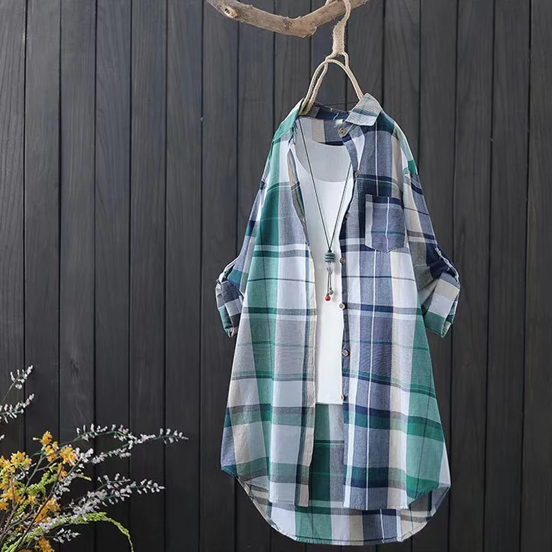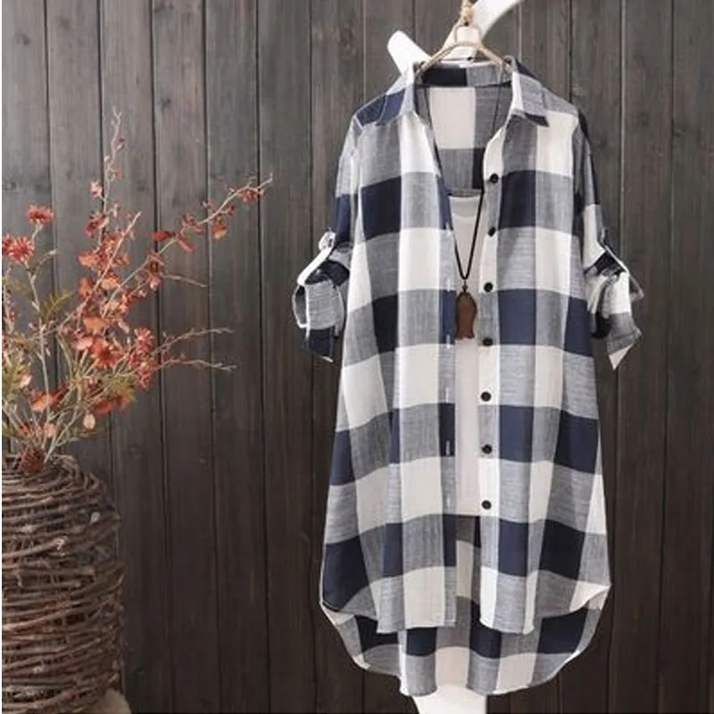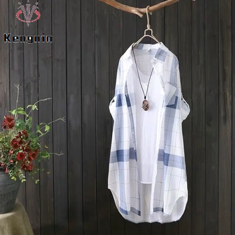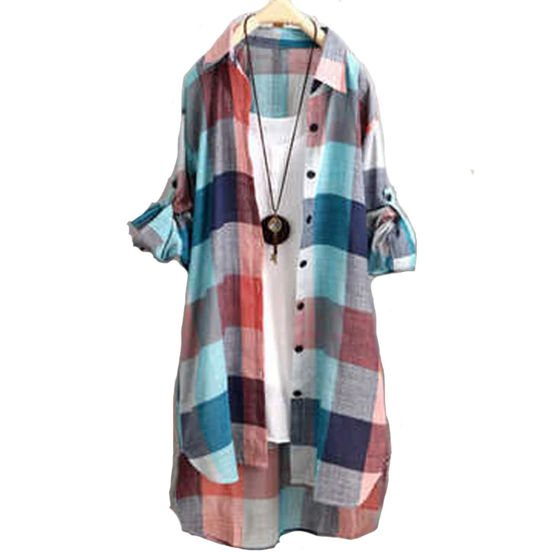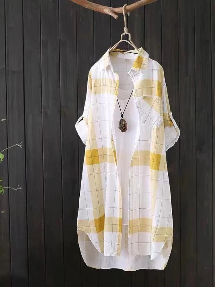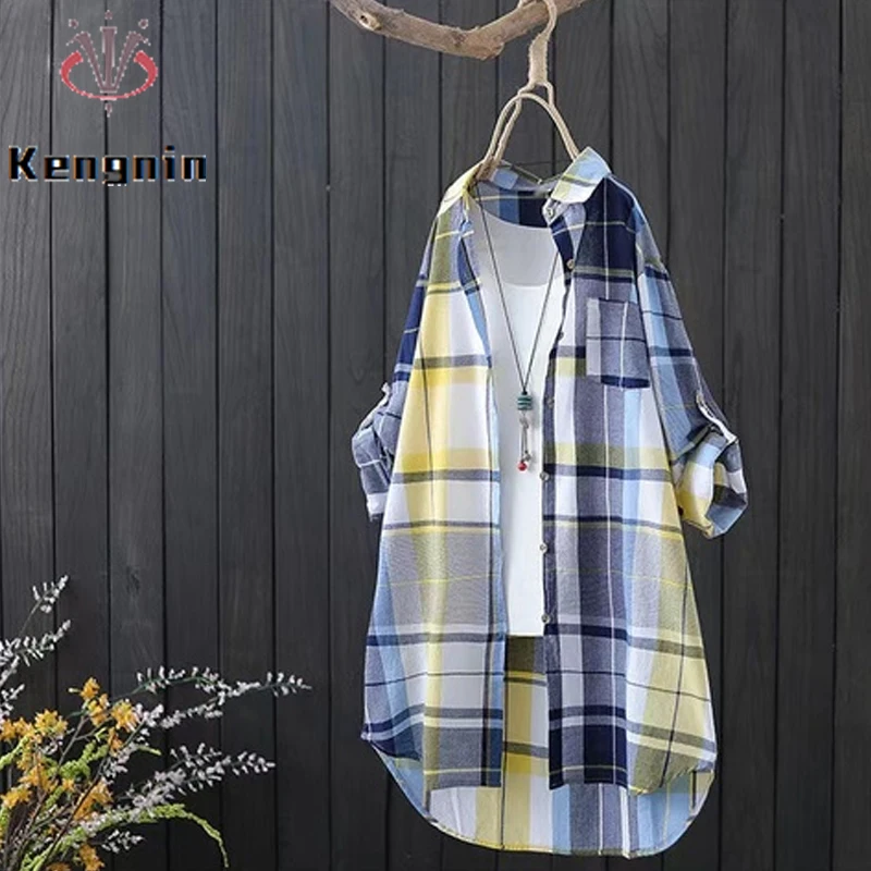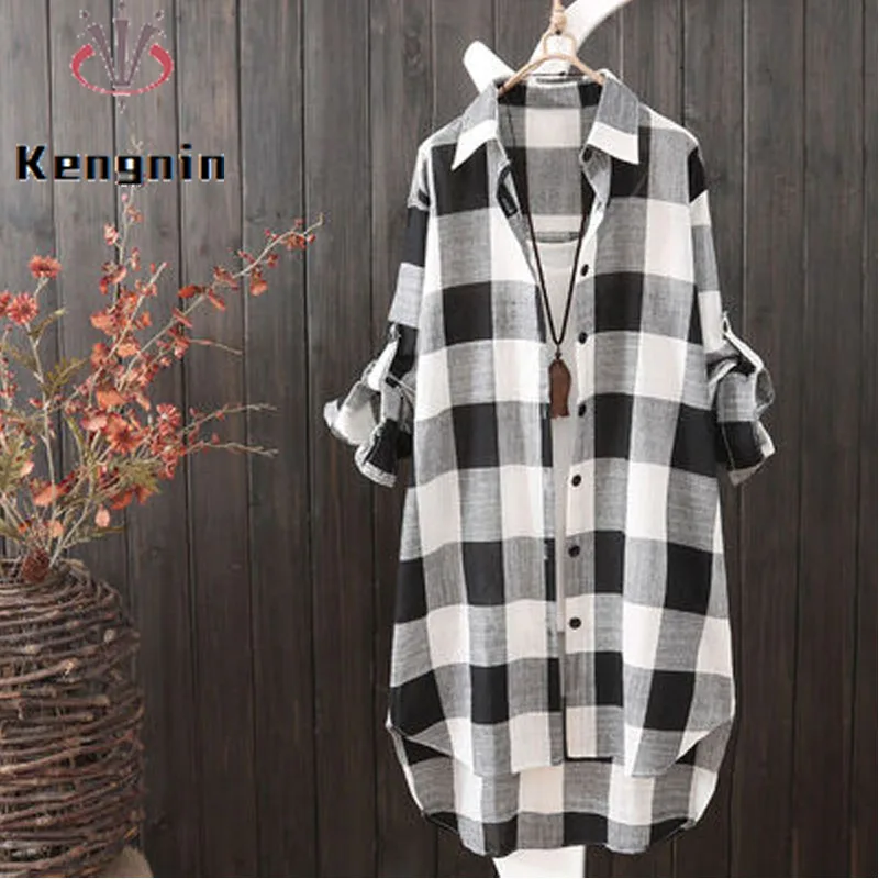 Женская Длинная блузка в клетку, свободная Повседневная рубашка с длинным рукавом, модель KN177, лето 2022