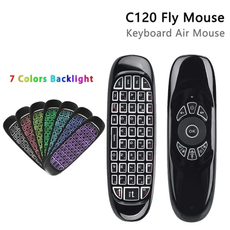 Примечание:1, встроенный 7 цветов с подсветкой, вы можете нажать «Fn + пробел», чтобы переключить различные задние2, с батареей: Он питается от литий-ионного аккумулятора (включая), и может быть заряжен через USB кабельОписание товара1. Поставляется с 2,4 ГГц QWERTY клавиатура + пульта дистанционного управления + Воздушная мышь 3-в-1 функции способны удовлетворить любые ваши потребности.2.2.4 ГГц технология беспроводной передачи, супер диапазон подключения может быть до 10 метров.3. Используя уникальную шестиосевую технологию гироскопа с 360 градусов в любом захвате, легко установить запястье, точно контролировать курсор мыши.4. Пульт дистанционного управления специально разработан для устройств android. Встроенная перезаряжаемая литиевая батарея, зарядка с помощью компьютера или другого постоянного тока 5 В.5. Светодиодный светильник индикатора для работы. Интеллектуальный антивибрационный дизайн, высокая стабильность. Совместимость с android/Windows/Linux/Mac.Характеристики:Модель: C120Тип: Воздушная мышьПодсветка: 7 цветов (как показано на фотографии)Голос: без микрофонаХарактеристики: мини, перезаряжаемыйМатериал: пластикПоддержка системы: для android,Linux,Mac OS,WindowsИнтерфейс: беспроводнойПодключение: USB2.0Диапазон частот: 2,00-2,483 ГГцРабочий ток: le 20mAТок сна: le 20mAДиапазон передачи: 10 мИсточник питания: литий-ионный аккумуляторПосылка включает в себя:1 x клавиатура C120 без микрофона1 х USB кабельРуководство пользователя на английском языке-1 шт.