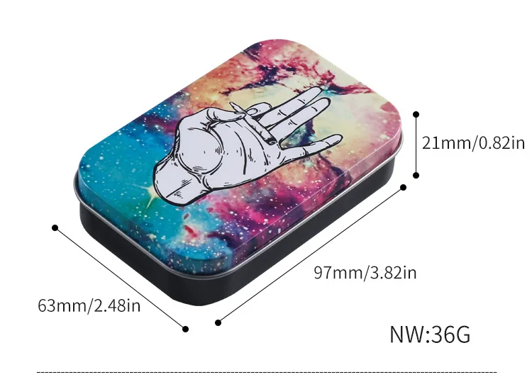 Материал: жестяная панель Размеры: длина 9,5 см, ширина 5,8 см, толщина 2,2 см Функция: вы можете положить Измельченный табак или 20 обычных сигарет (длина 83 мм) Вес: около 36 г Упаковка: opp мешок Поддержка оптовой продажи. Поддержка глобальных перевозок