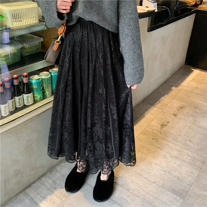 Эластичная кружевная юбка с высокой талией, женская элегантная повседневная черная длинная юбка А-силуэта на весну и осень, модная женская свободная повседневная юбка