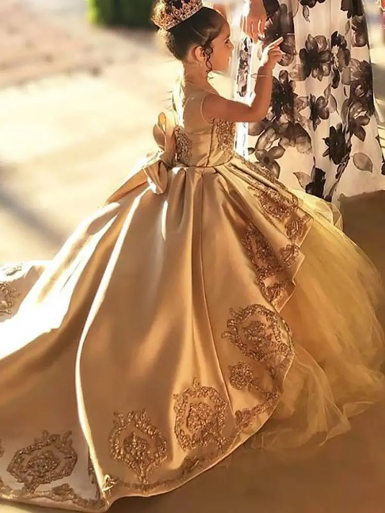 Детское Атласное Бальное Платье, с золотыми аппликациями и бантом, для первого причастия, 1 шт.