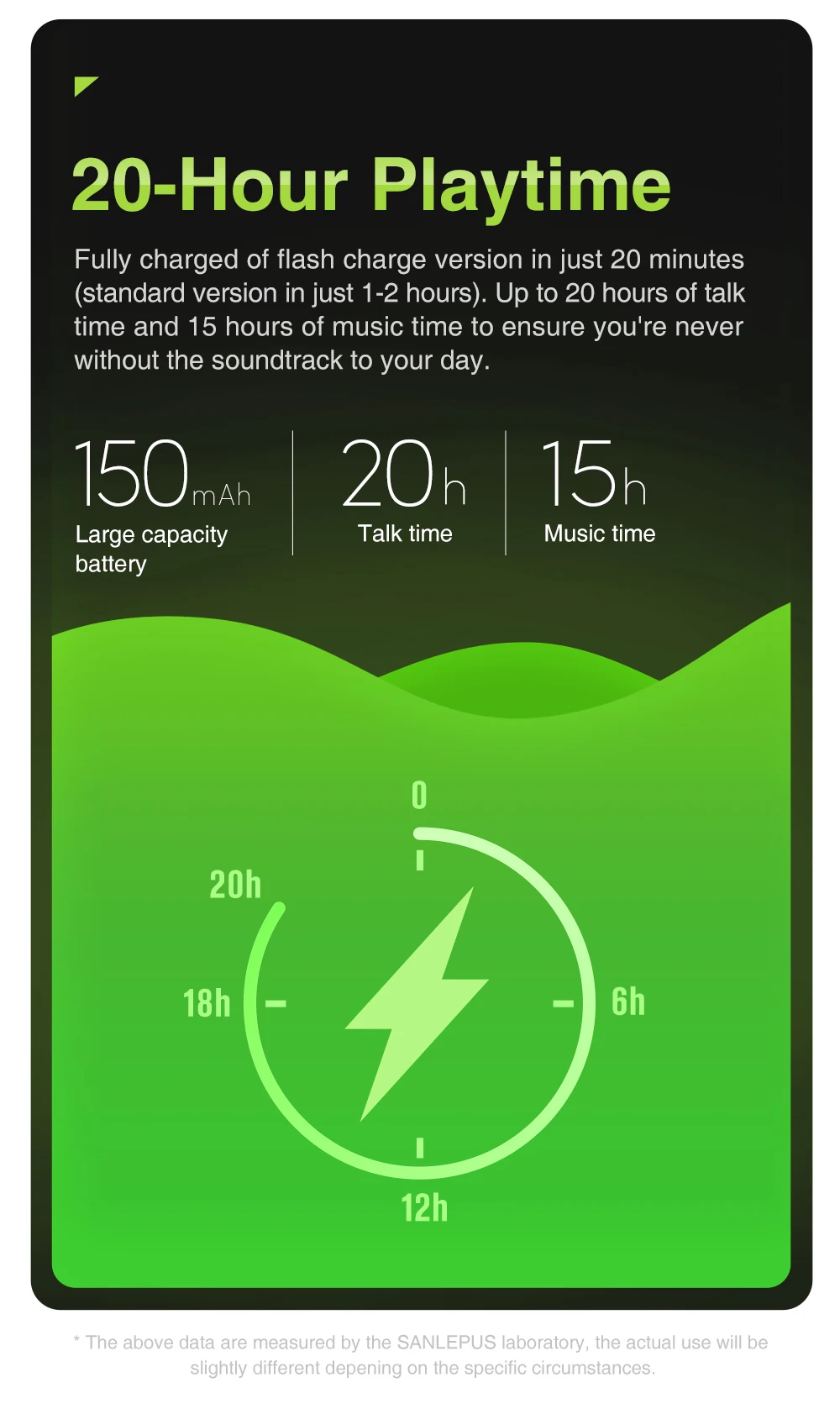 Полная зарядка вспышки всего за 20 минут (стандартная версия всего за 1-2 часа). До 20 часов в режиме разговора и 15 часов в режиме музыки, чтобы гарантировать, что вы никогда не останетесь без саундтрека к своему дню.Аккумулятор большой емкости 150 мАч20 часов в режиме разговора15 часов воспроизведения музыки* Вышеуказанные данные измерены лабораторией SANLEPUS, фактическое использование может немного отличаться в зависимости от конкретных обстоятельств.
