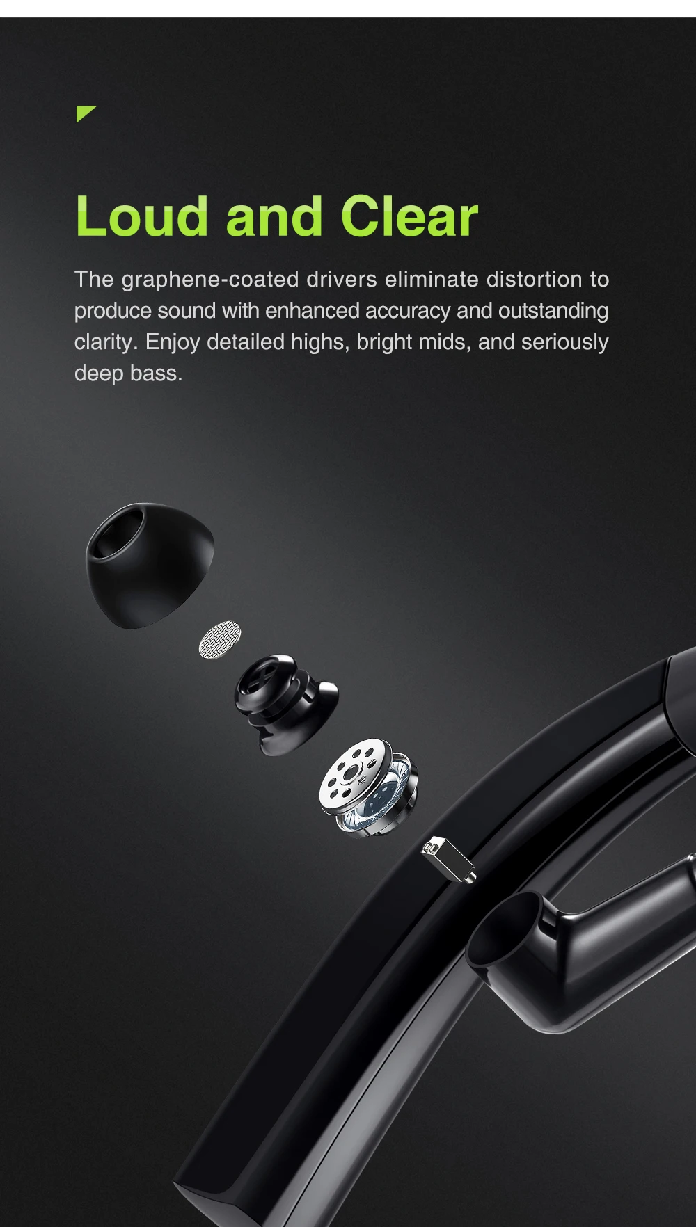 Драйверы с графеновым покрытием исключают искажения и издают звук с повышенной точностью и исключительной четкостью. Наслаждайтесь детализированными максимумами, яркими средними частотами и серьезно глубокими басами.