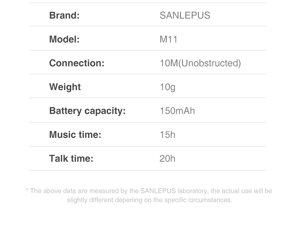Бренд: SANLEPUSРежим: M11Подключение: 10 м (беспрепятственное)Вес: 10 гЕмкость аккумулятора: 150 мАчВремя прослушивания музыки: 15 чВремя разговора: 20 ч* Вышеуказанные данные измерены лабораторией SANLEPUS, фактическое использование может немного отличаться в зависимости от конкретных обстоятельств.