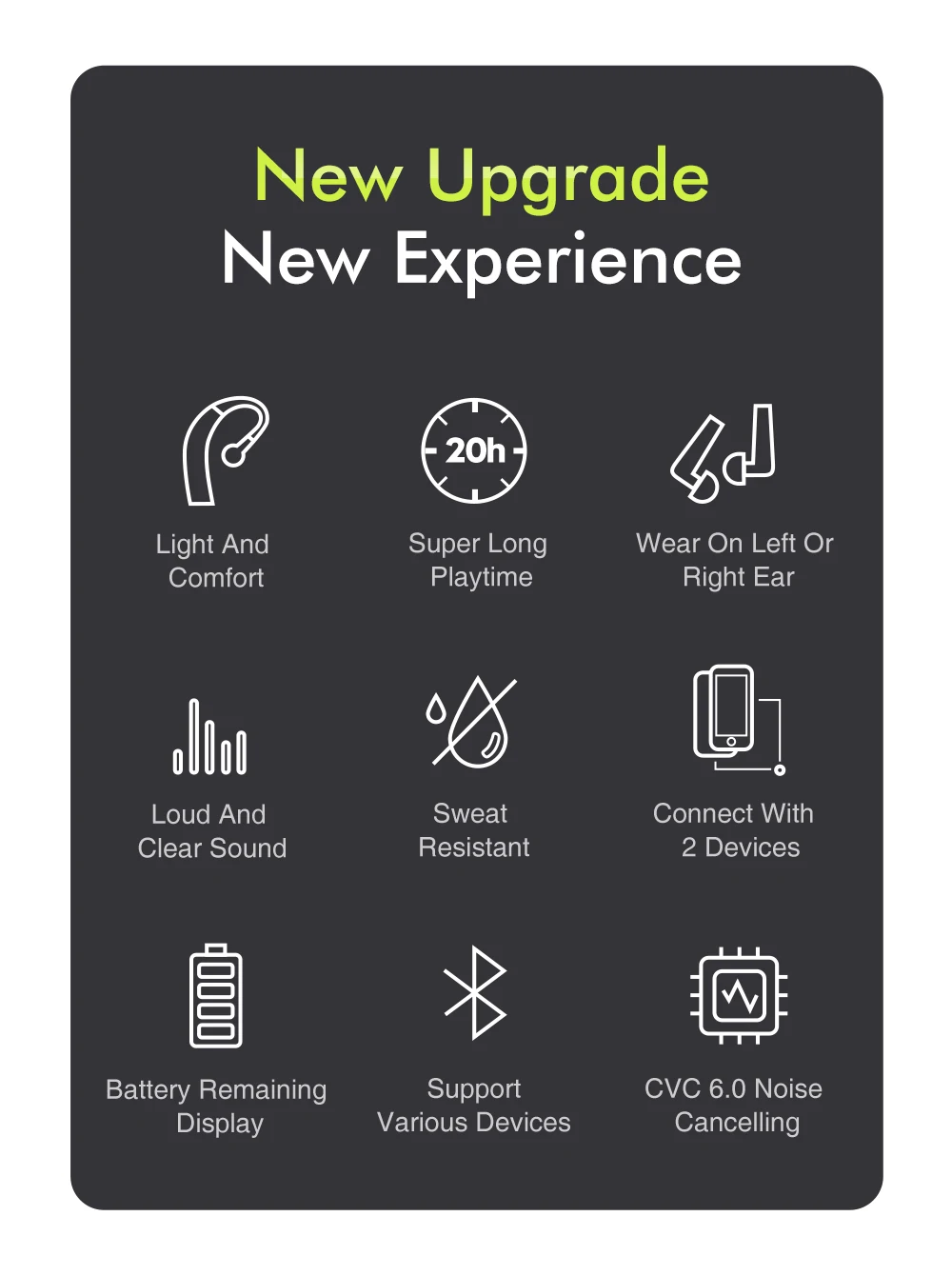 Светильник и удобныйОчень долгое время игрыНосить на левом или правом ухеГромкий и чистый звукЗащита от потаПодключение к 2 устройствамДисплей батареиПоддержка различных устройствCVC 6,0 шумоподавление