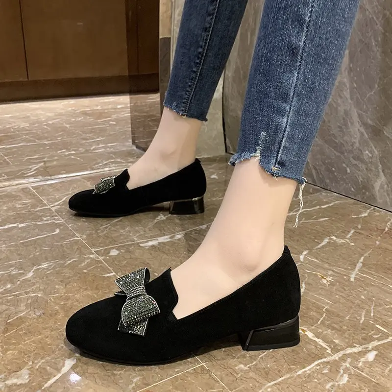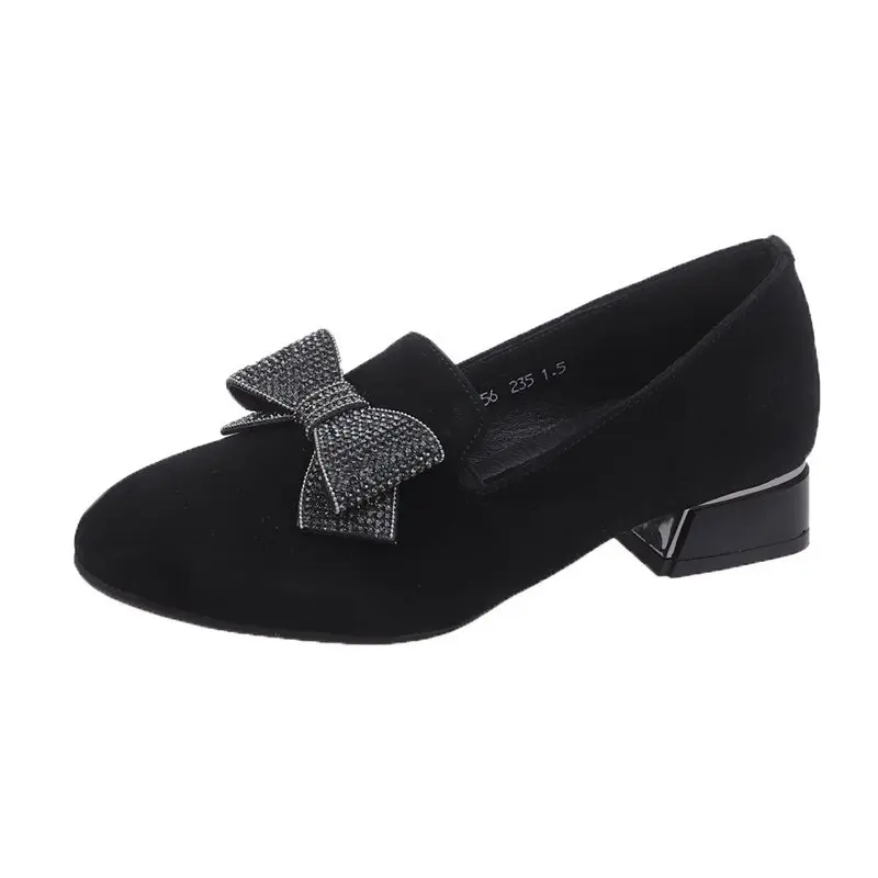Женские туфли-лодочки 3 см; Черные туфли-лодочки из флока; Модельные туфли на низком каблуке; Туфли без застежки с бантиком; Офисная Женская обувь; 8920C