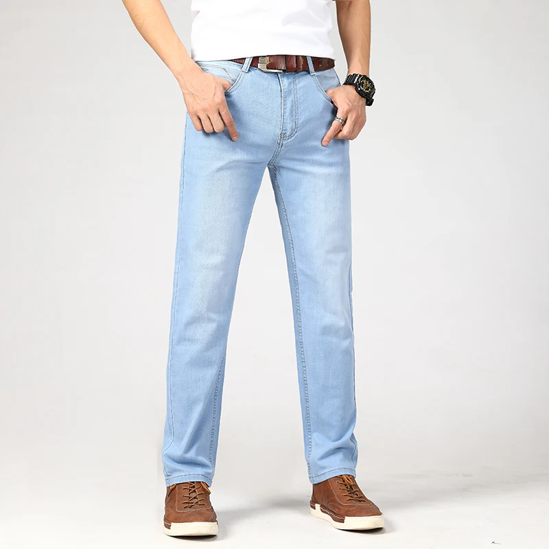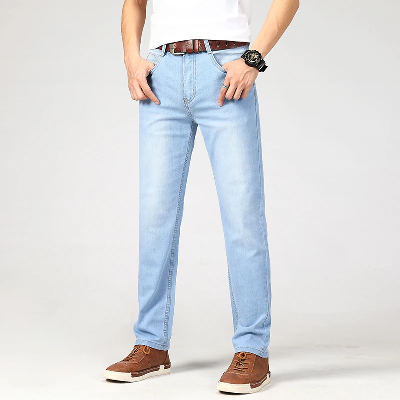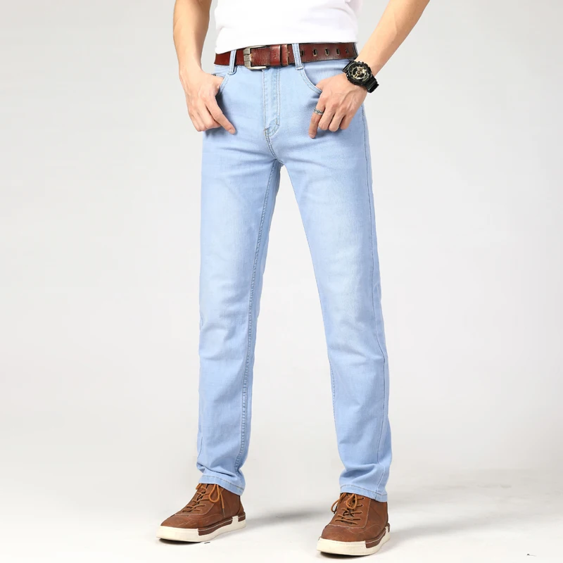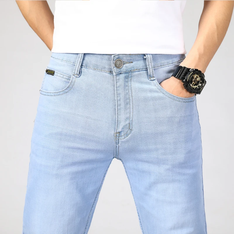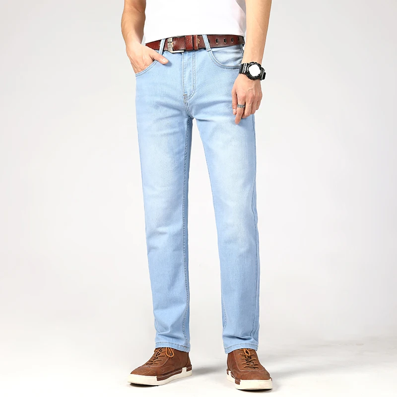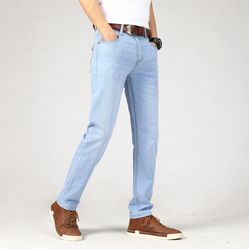 Джинсы мужские, тонкие, небесно-голубые, эластичные, повседневные, зауженные, на лето, 2021