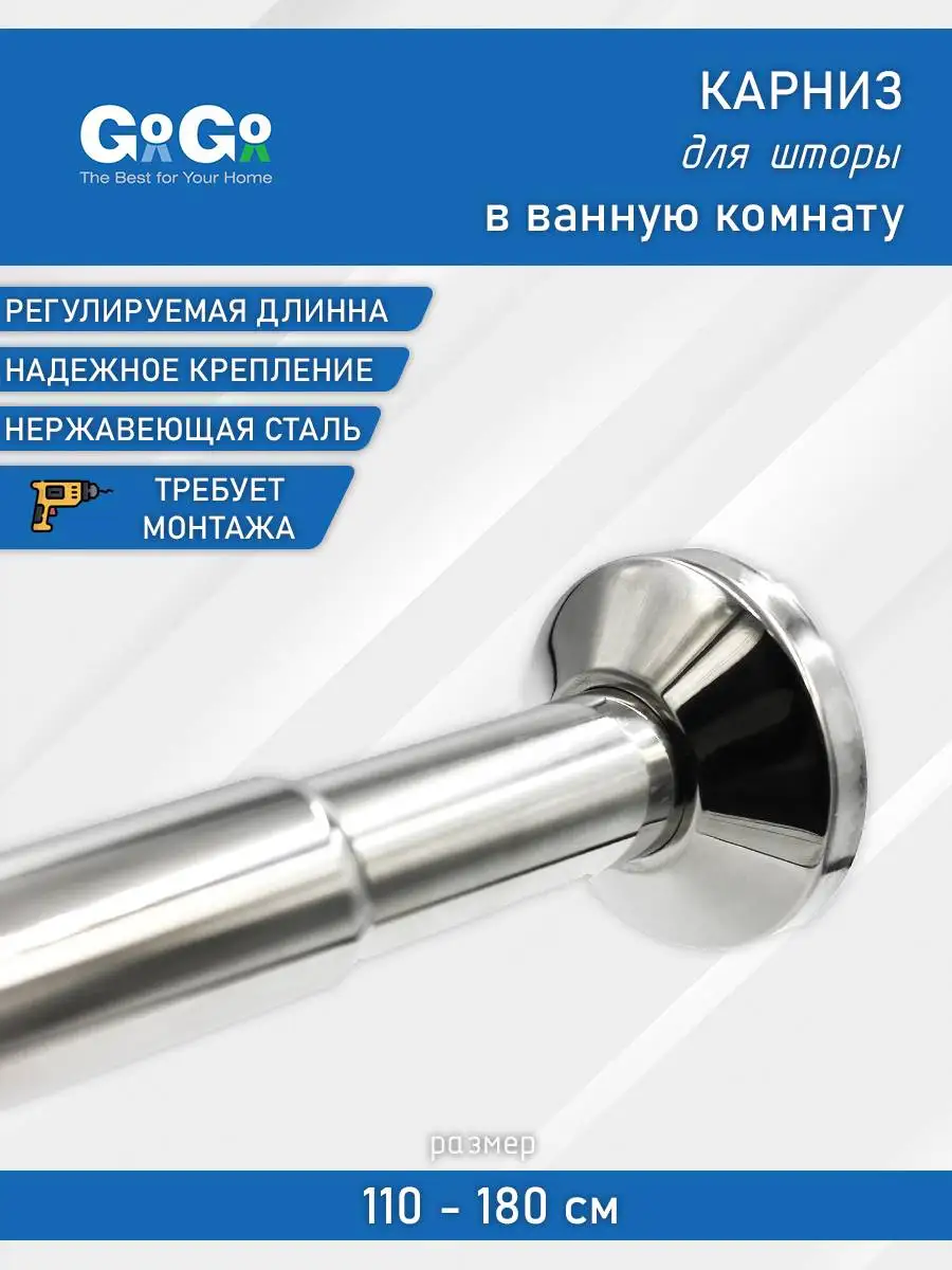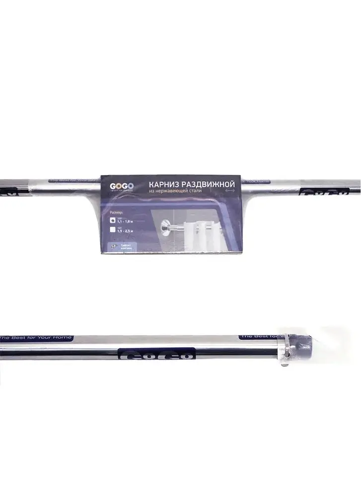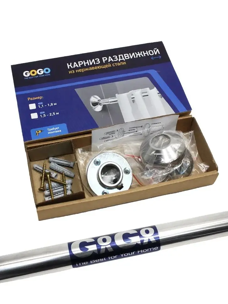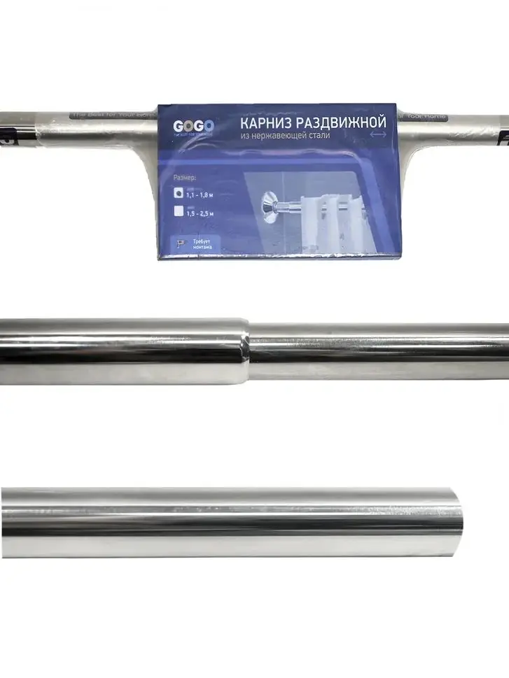 Карниз GoGo 110x180 телескопический нержавеющая сталь труба D25, раздвигается от 1,1м до 1,8 м, прочное крепление к стене шурупы и саморезы, выдерживает высокие перепады температуры и влаги. В комплекте крепление и подробная инструкция по сборке. Срок службы не ограничен. Производство Россия