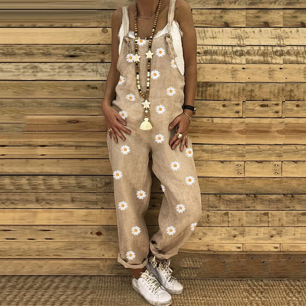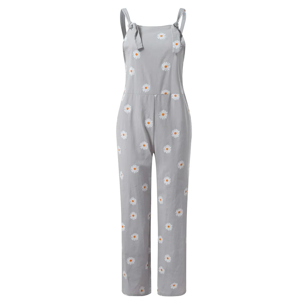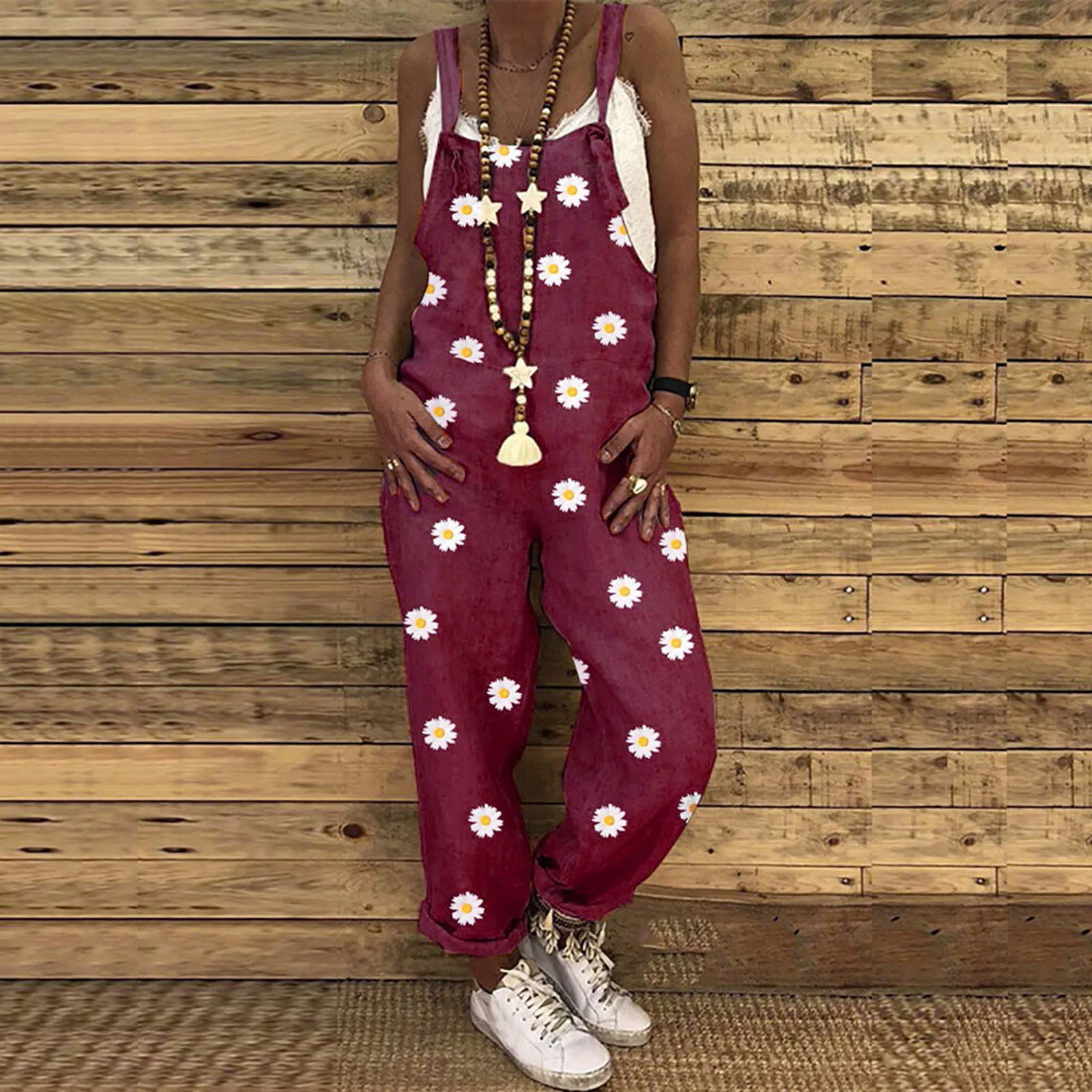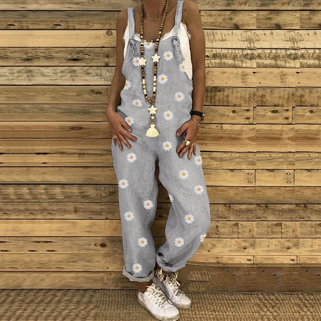 Комбинезон женский оверсайз в стиле бохо, повседневный Длинный свободный пикантный ромпер с цветочным принтом, на бретелях, на пуговицах, # T2G
