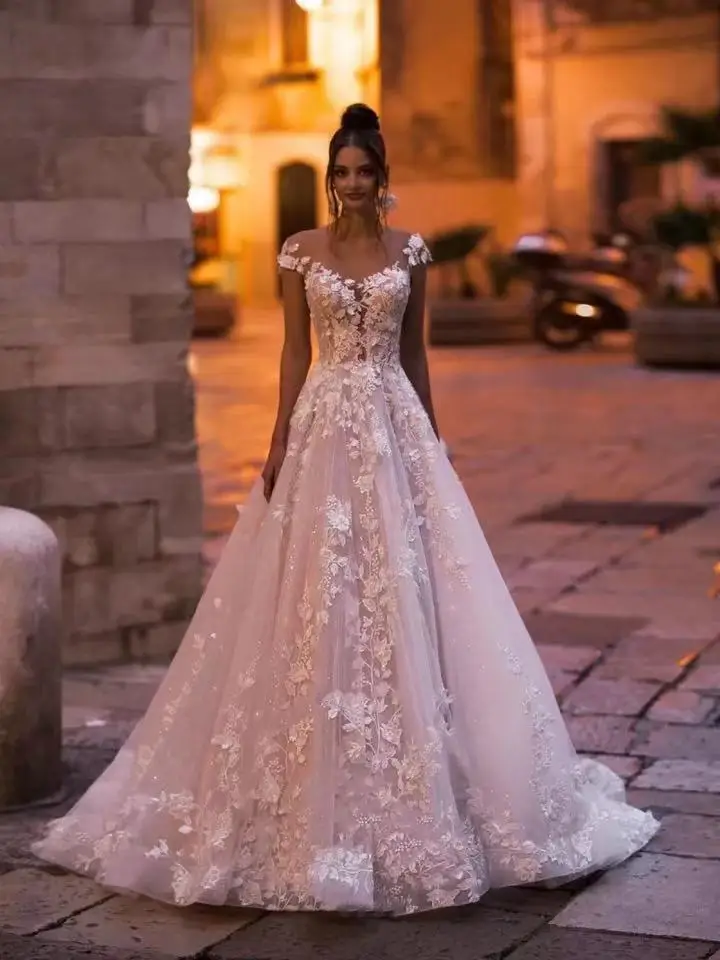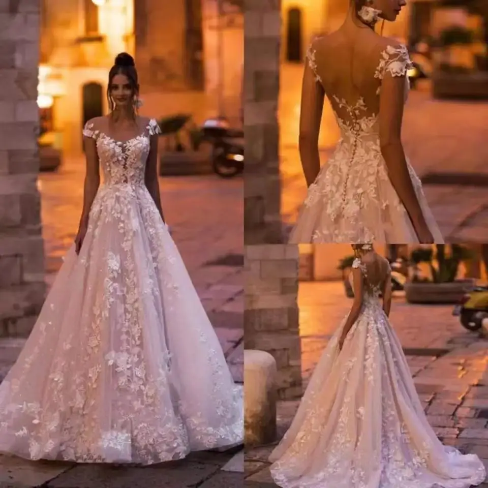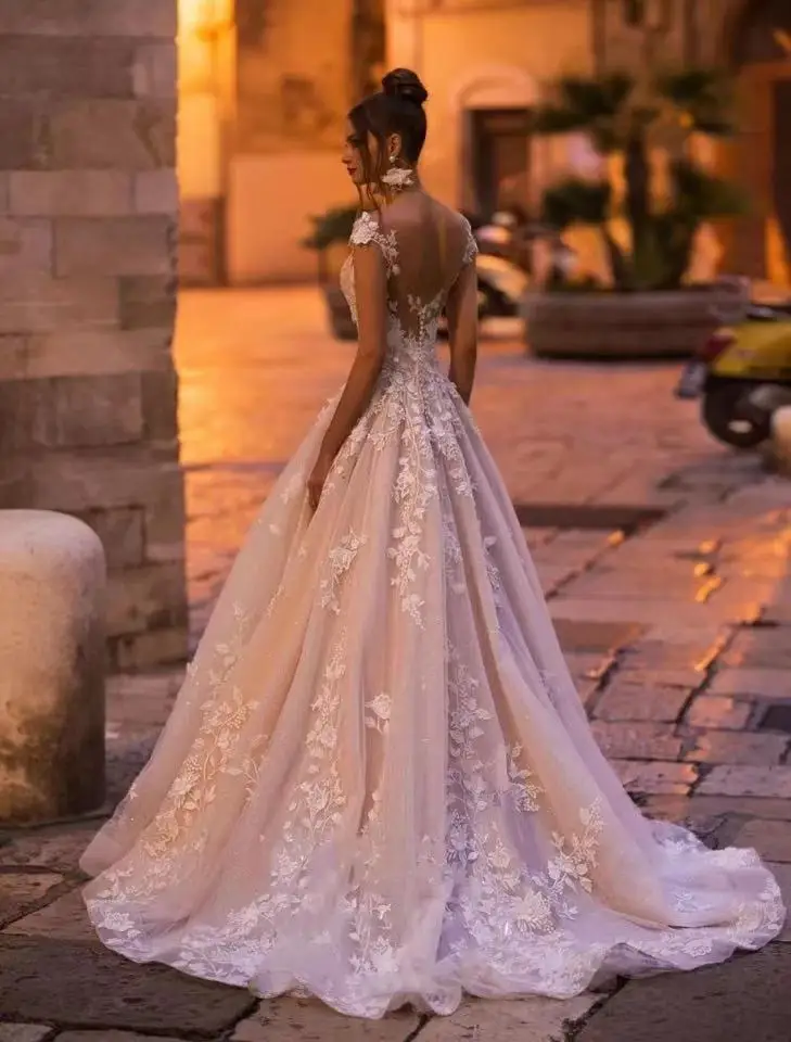 Женское свадебное платье с открытой спиной, кружевное винтажное платье принцессы с цветочной аппликацией, расшитое бисером, со шлейфом, трапециевидного силуэта, 2021